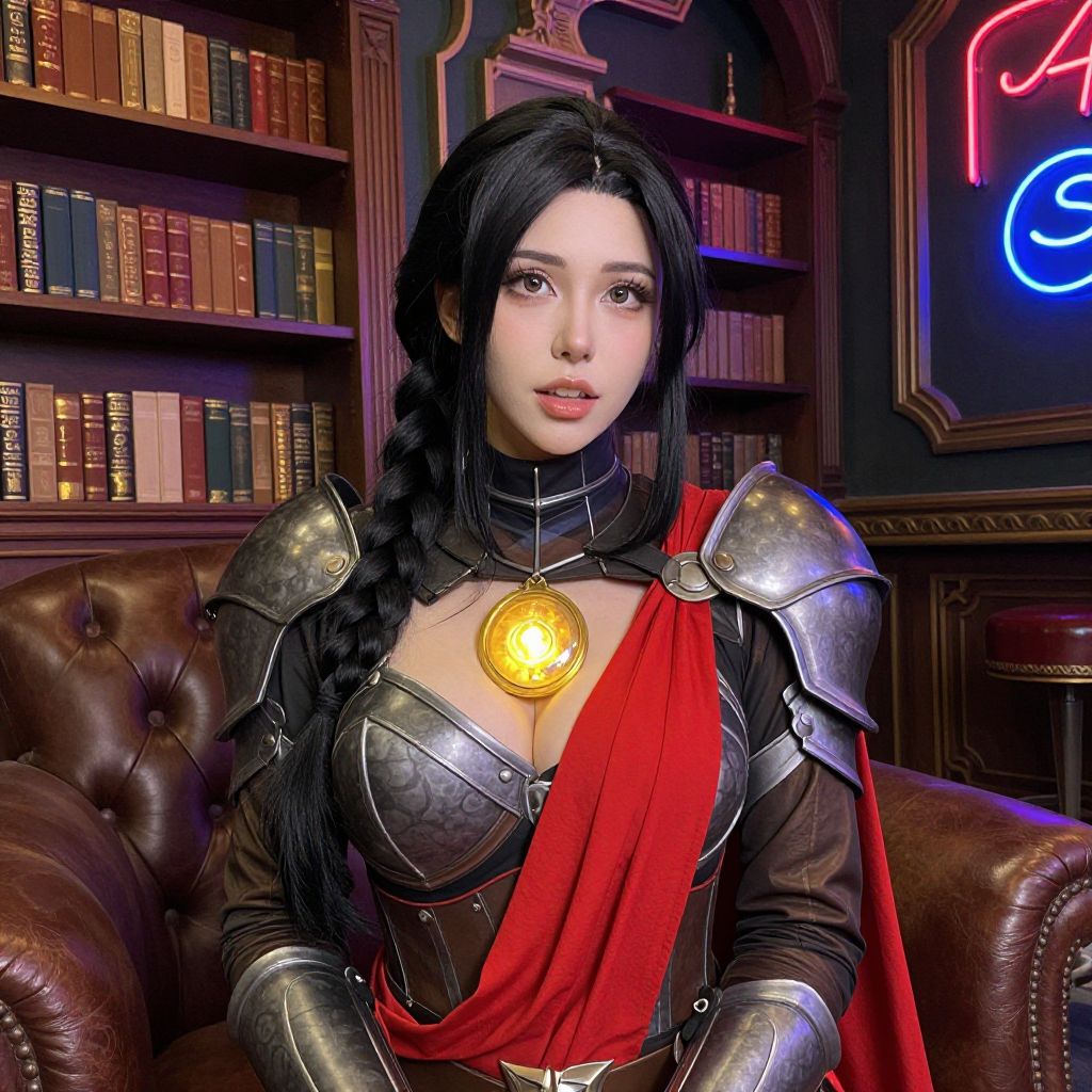 Photorealistic digital artwork of an Asian woman with long, black braided hair, wearing medieval-style silver armor with a red cape draped over her right shoulder. Her armor is intricately detailed, covering her chest and shoulders, with a glowing, circular golden pendant at her collarbone. She has a fair complexion and an alluring expression. The background features a dimly lit library with wooden bookshelves filled with books, a dark brown leather armchair, and a neon sign on the right. The image combines elements of fantasy and realism, creating a captivating and detailed scene.