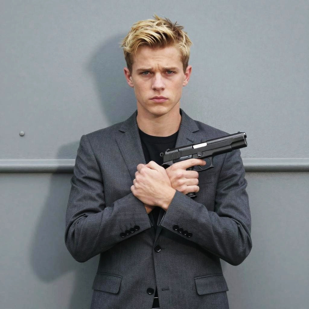 Photograph of a young man with short, blonde hair standing against a gray, industrial-style wall. He's wearing a dark gray suit and holding a black handgun across his chest with both hands. His expression is serious and focused, with a slight shadow cast behind him. The lighting is bright, highlighting his face and the gun, while the background is slightly blurred.