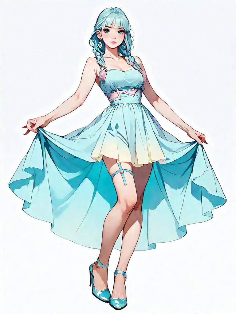 1girl, source_comics, realistic face, full body shot, Woman, minimalist elegance, sheer panel midi dress in pastel lilac, scoop neck, thin straps, fitted bodice, sheer flared skirt from thigh level, solid underlay mini skirt, transparent heels, no visible jewelry, braided hair with long tail, photo studio background.
