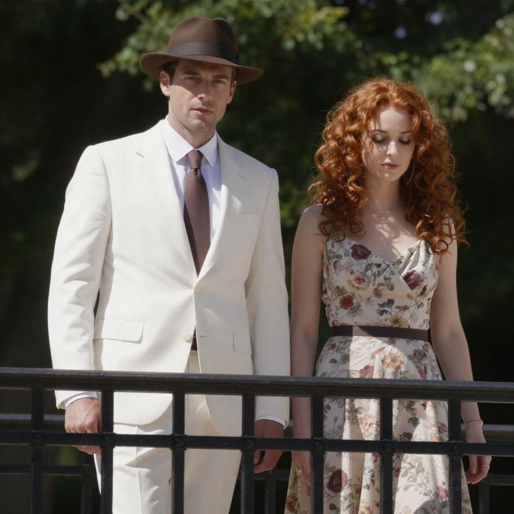 Photograph of a man and woman standing side by side behind a black iron railing. The man, in a white suit and brown fedora, leans slightly forward. The woman, with curly red hair, wears a floral dress and looks down. Bright sunlight highlights their outfits, with a green, tree-filled background in the background.