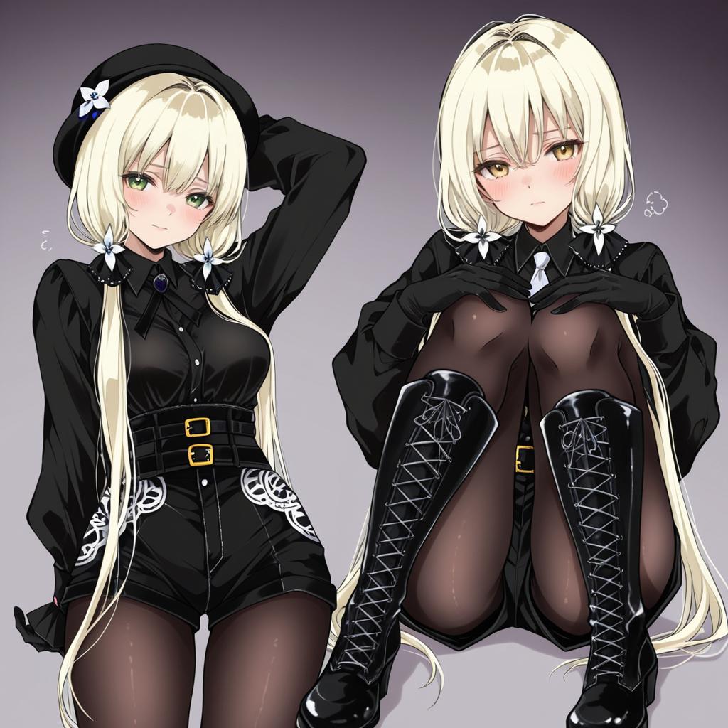 Monoyoshi sadamune, touken ranbu, 1boy, yellow eyes, blonde hair, pantyhose under shorts, lace-up boots, by artist chigasaki yukari, dark_illustrious
