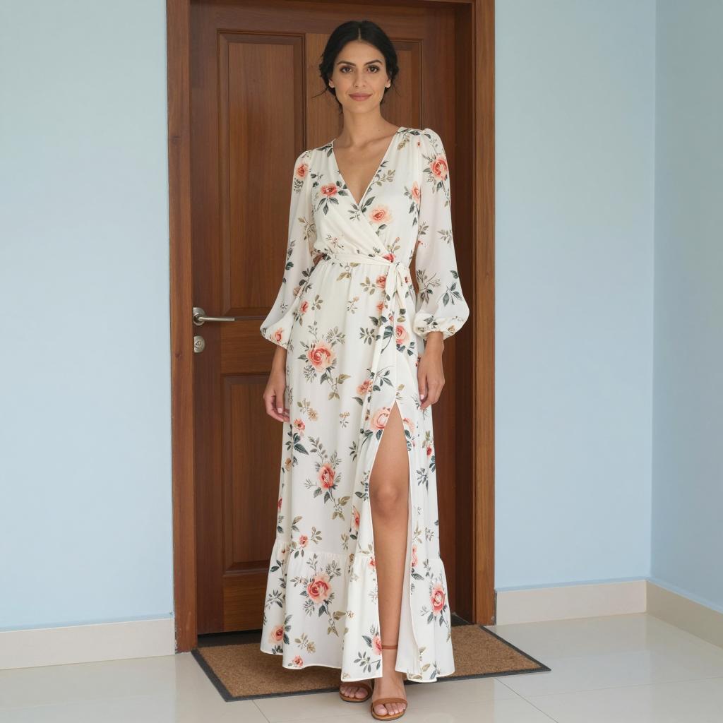 Full body shot of a young woman standing indoors wearing a floor-length pink draped gown with puffed long sleeves and a black belt. She has long brown hair styled in a side braid with a pink flower hair accessory. The background features a neutral wall with green potted plants and gray tiled floor. She wears brown strappy sandals and smiles softly, exuding elegance and grace.