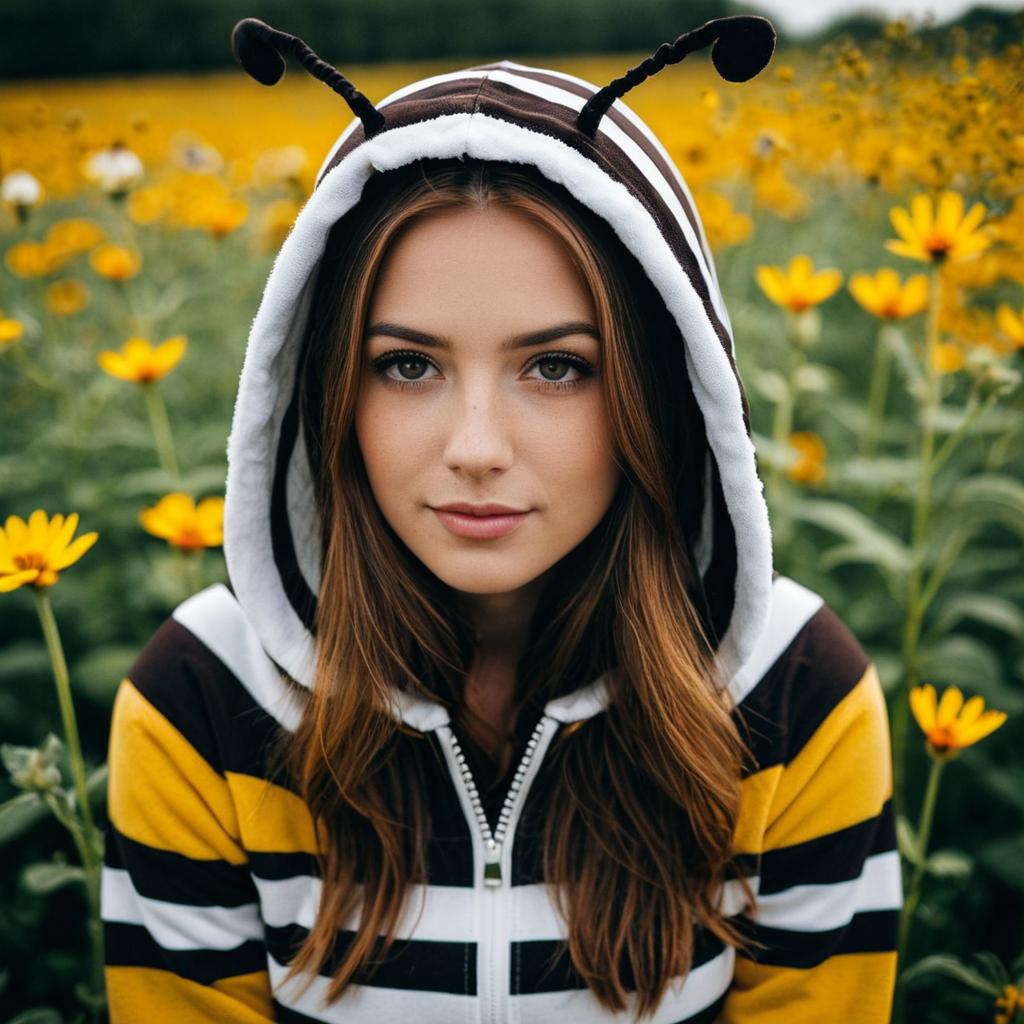 Tweety pie outfit,1girl, shorts, solo, long hair, hat, yellow shorts, crop top, yellow theme, midriff, looking at viewer, long sleeves, blurry background, blurry, bee, yellow headwear, bird, cowboy shot, blonde hair, sweater, realistic, brown hair