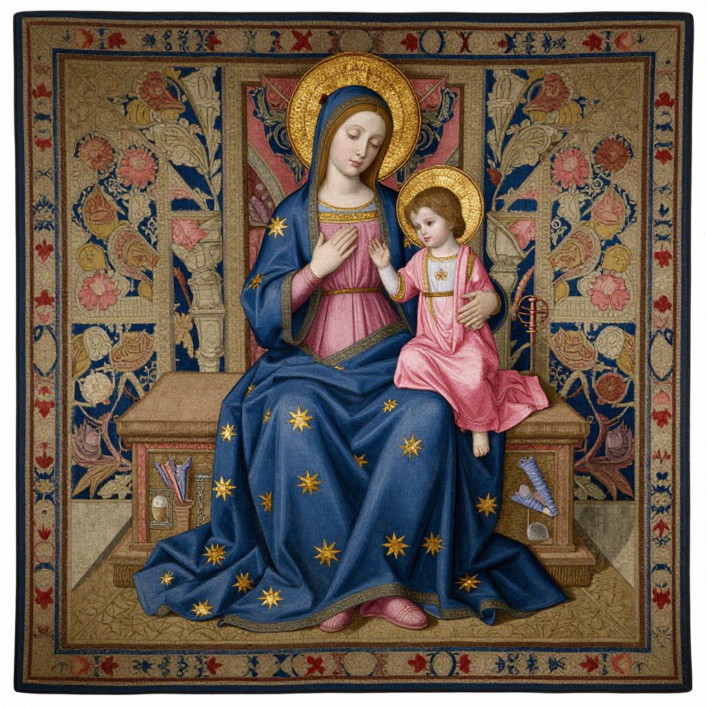 Medieval-style religious painting of the Virgin Mary with golden halo, blue robe with stars, holding baby Jesus in pink dress, floral backdrop, seated on