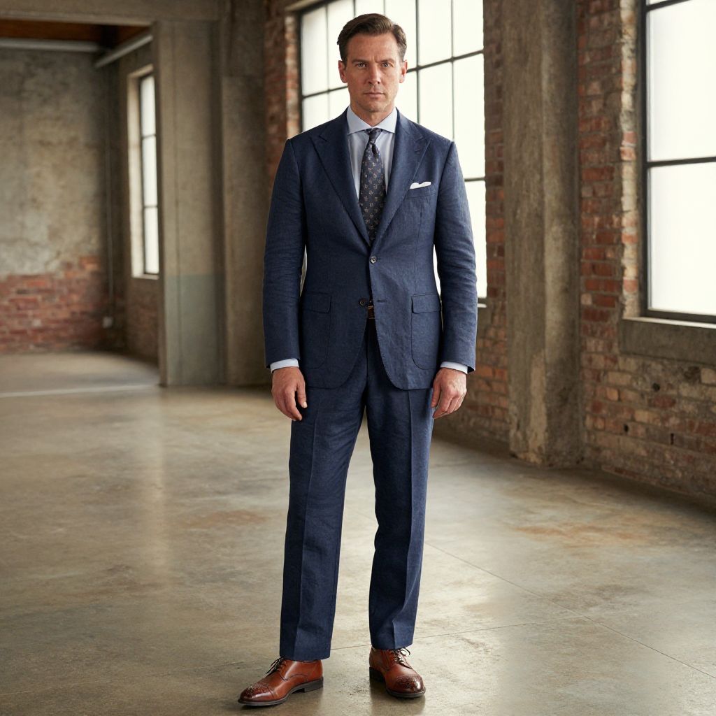 A man, tailored navy blue linen suit, light blue cotton dress shirt, patterned silk tie, brown leather brogues, matching leather belt, industrial loft space, exposed brick, soft golden hour light, confident expression, oversaturated film style. Man has masculine face and piercing eyes