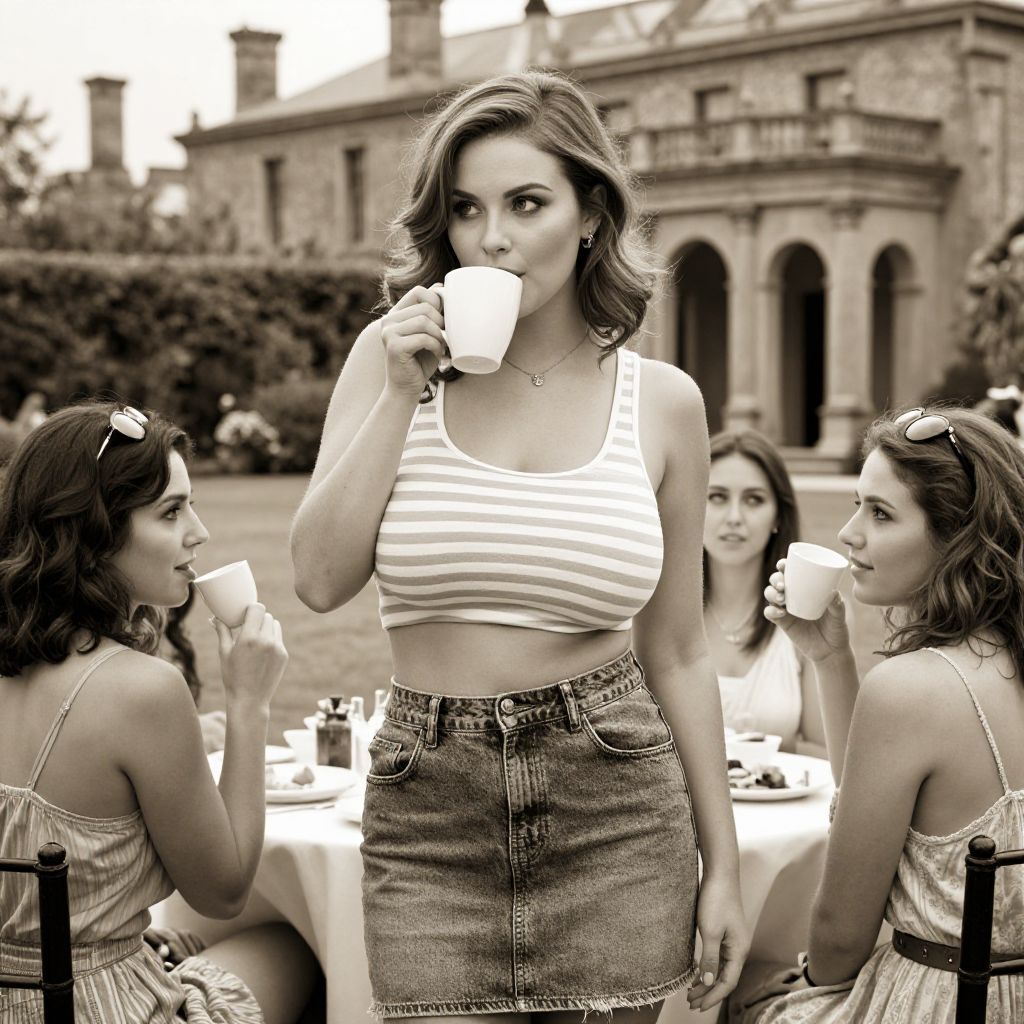 A lanky woman in a cropped gray and white striped tank top and a high-waisted denim skirt stands in a picturesque outdoor brunch setting at a historical estate. With a sepia effect enhancing the scene, she sips coffee while chatting with friends, her lightweight makeup and natural hairstyle complementing the relaxed atmosphere. Sexy. Pretty face and beаutiful eyes. Big breasts