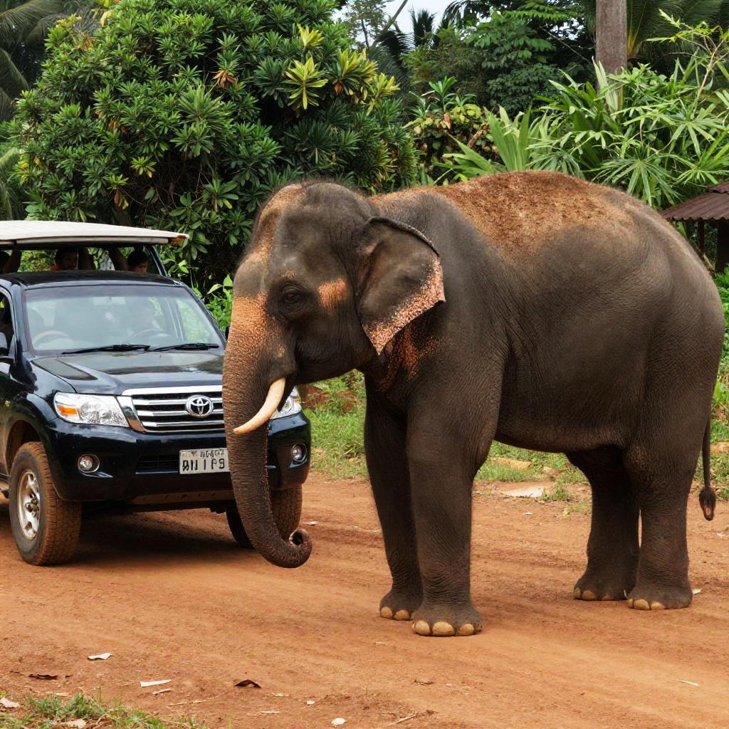 Photograph of a large, white, neoclassical building with a domed roof, set against a clear blue sky. In the foreground, a black elephant with gold-painted tusks and a red and gold embroidered saddle walks on a city street. A person sits on the elephant's back, wearing a black shirt and dark pants. Surrounding the building, there are parked cars and trees with green foliage. The building's ornate architectural details and the elephant create a striking contrast between traditional and modern elements. The street is slightly curved, adding depth to the scene.