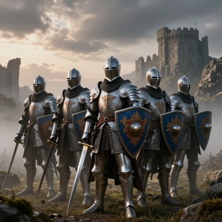 Knights in shining armor standing proudly on a misty battlefield at dawn, detailed medieval helmets, ornate shields, and swords gleaming, surrounded by a dramatic cloudy sky and ancient stone castle ruins in the background, epic fantasy style.
