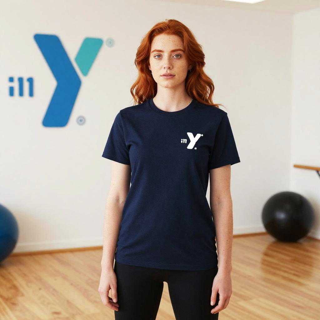 Portrait of a young red-haired Caucasian woman with freckles standing in a YMCA gym room. She is wearing a navy blue T-shirt with the 'in Y.' logo and black leggings. The background shows wooden flooring, exercise balls, and the YMCA logo on the wall.