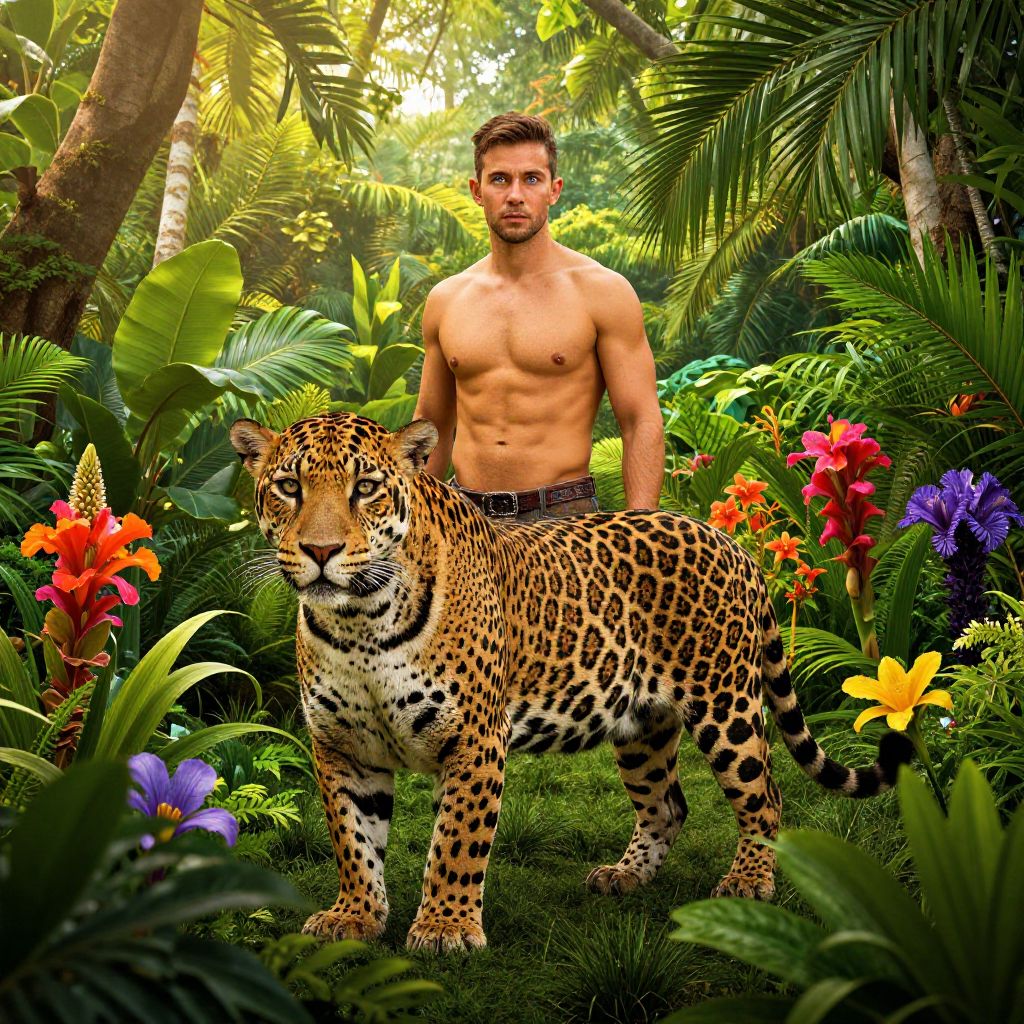 [[man,jaguar pictures animal]]Vibrant, tropical jungle landscape, dense foliage, bright sunlight filtering through leaves, colorful flowers blooming around them, man standing confidently alongside a majestic jaguar, both radiating strength, serenity, and harmony, oversaturated colors emphasizing the lush environment, dynamic composition, captivating gaze, striking contrast between human and animal forms. Man has masculine face and piercing eyes