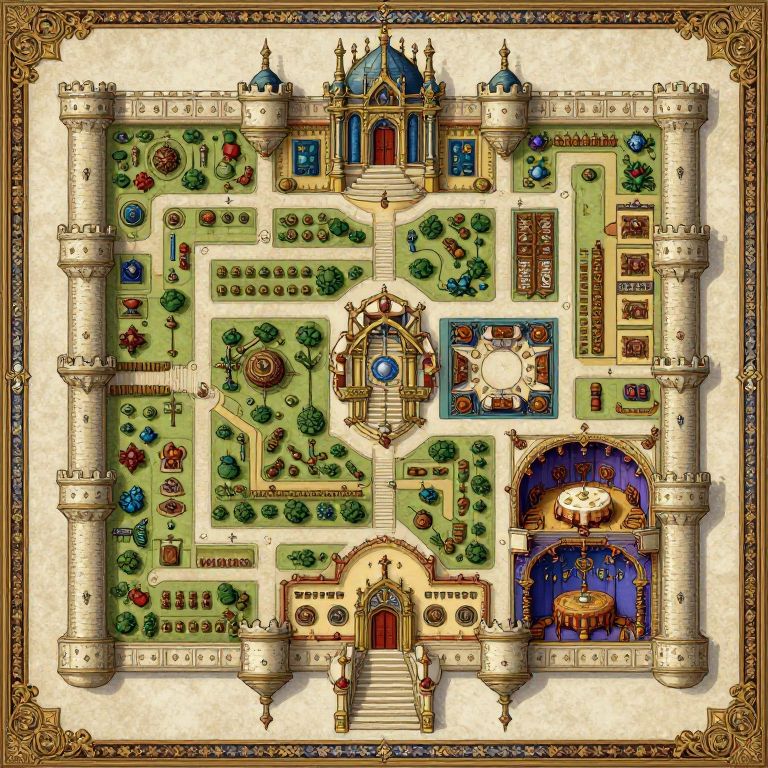 Fantasy castle floor plan featuring multi-level towers, secret passageways, enchanted gardens, banquet halls, armories with mythical weapons, and an ancient wizard’s chamber, illustrated in a colorful illuminated manuscript style with elaborate borders.
