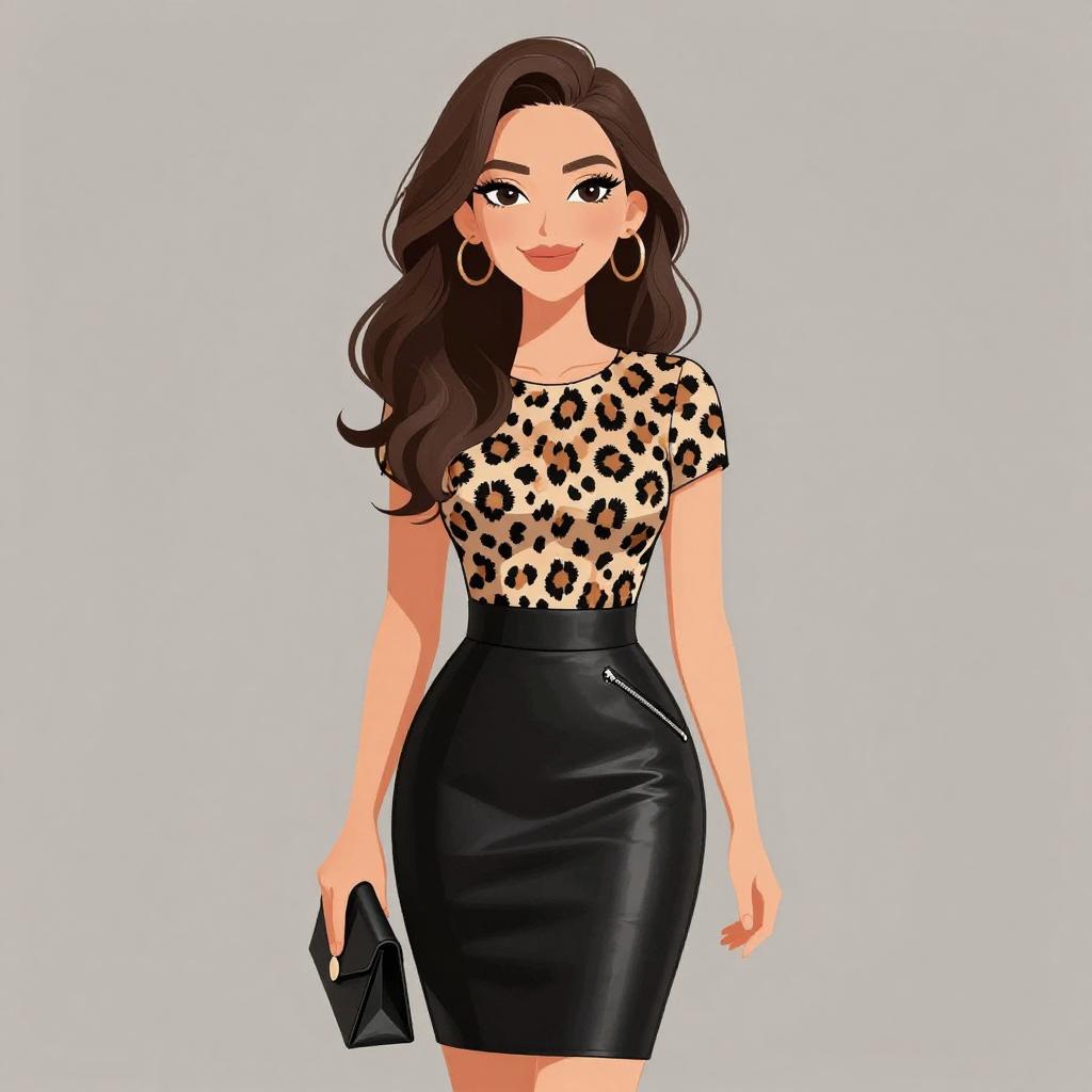 Woman with pretty face and pretty hair. smiling Woman, trendy fashion, leopard print blazer with shawl lapels, fitted cut, three-quarter length sleeves, white scoop neck tank top, high-waisted black mini skirt, thick gold chain necklace. --sref 1467