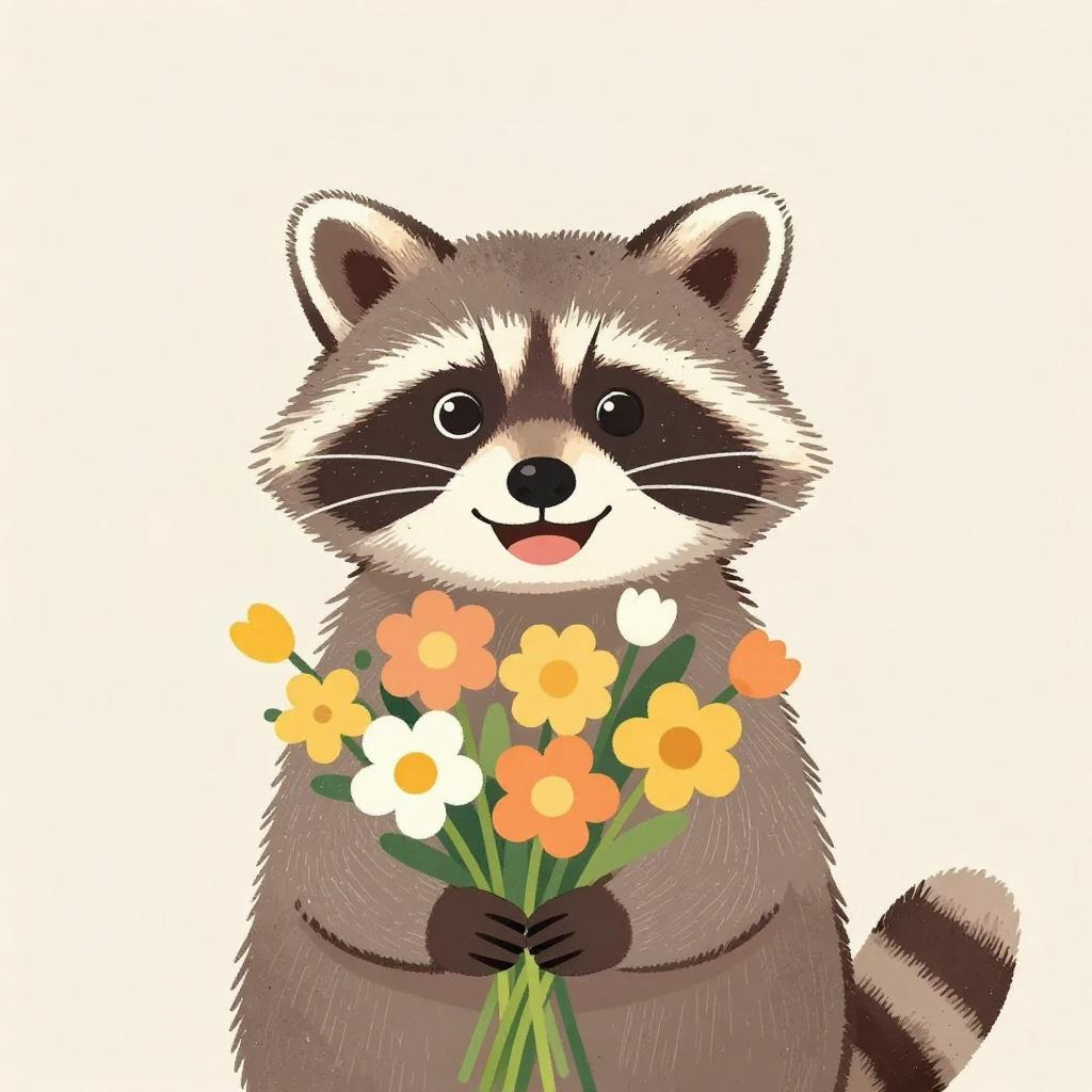 Cute kawaii-style raccoon peeking out from a teal trash can filled with vibrant colorful flowers and green leaves. Digital 3D vector art with hand-drawn look, soft lighting, and retro aesthetic on a solid peach background. Isometric, low-poly style artwork resembling a Redbubble-style sticker with sharp focus on the character.