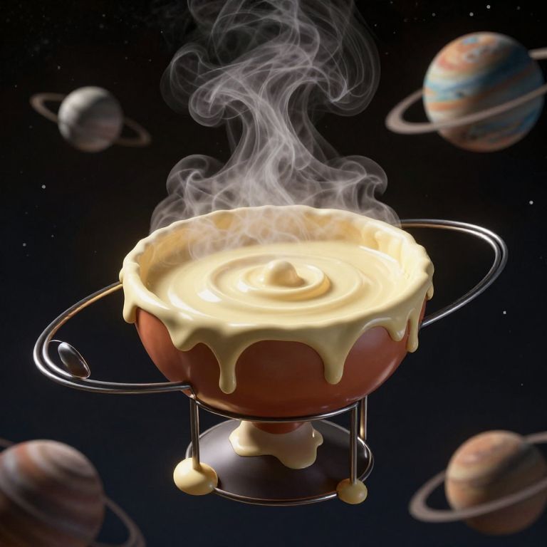 A colossal, steaming fondue pot floats serenely in the cosmic void, its rich, molten contents dripping like celestial rivers while tiny planets orbit around it like moons, creating a surreal tableau where earthly indulgence meets otherworldly wonder.