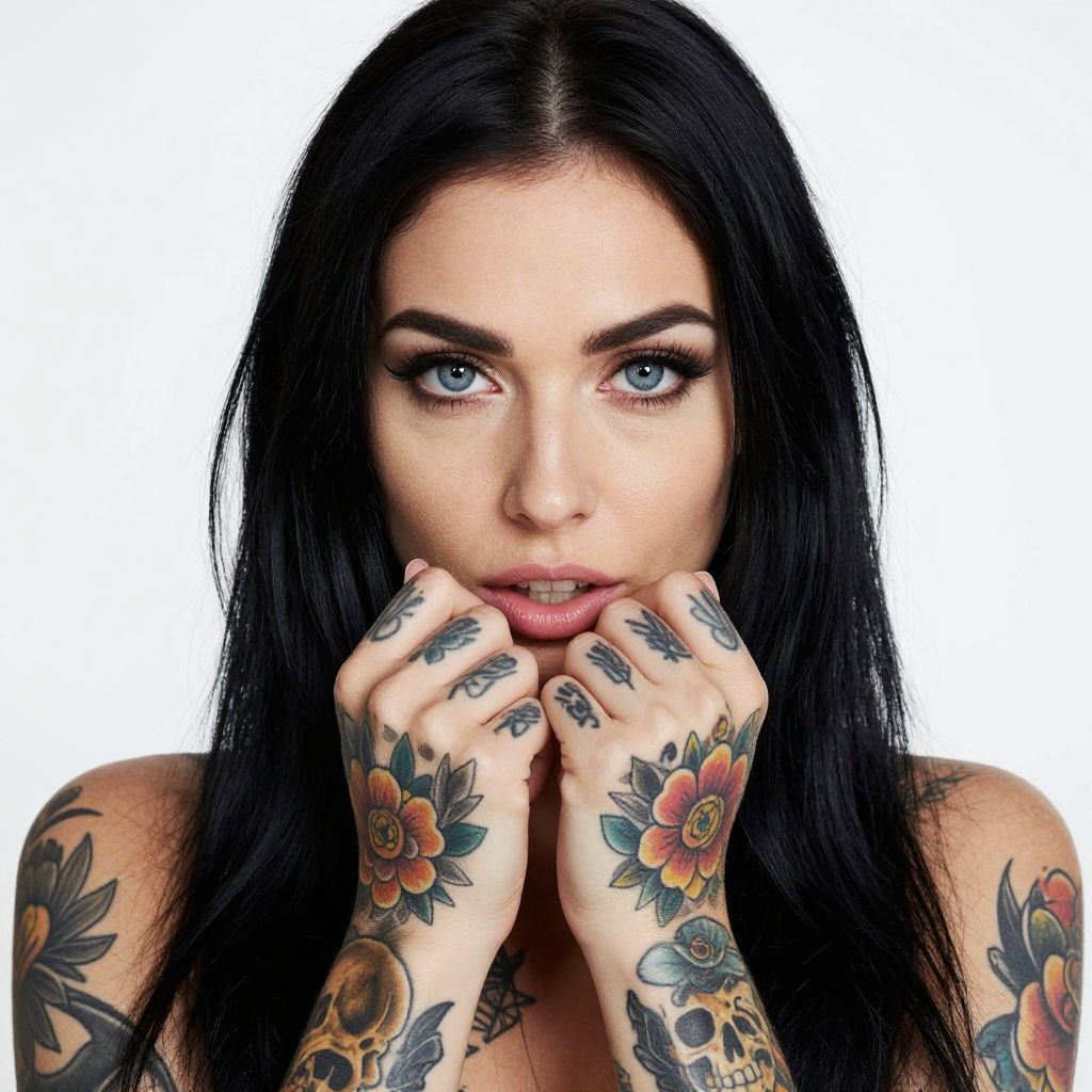 Photograph of a tattooed woman with long, straight black hair and striking blue eyes. She's holding her lips with her tattooed hands, which feature colorful floral and skull designs. She has full eyebrows and is wearing subtle makeup. Her expression is pensive, and she's against a plain white background, drawing focus to her detailed tattoos and intense gaze.