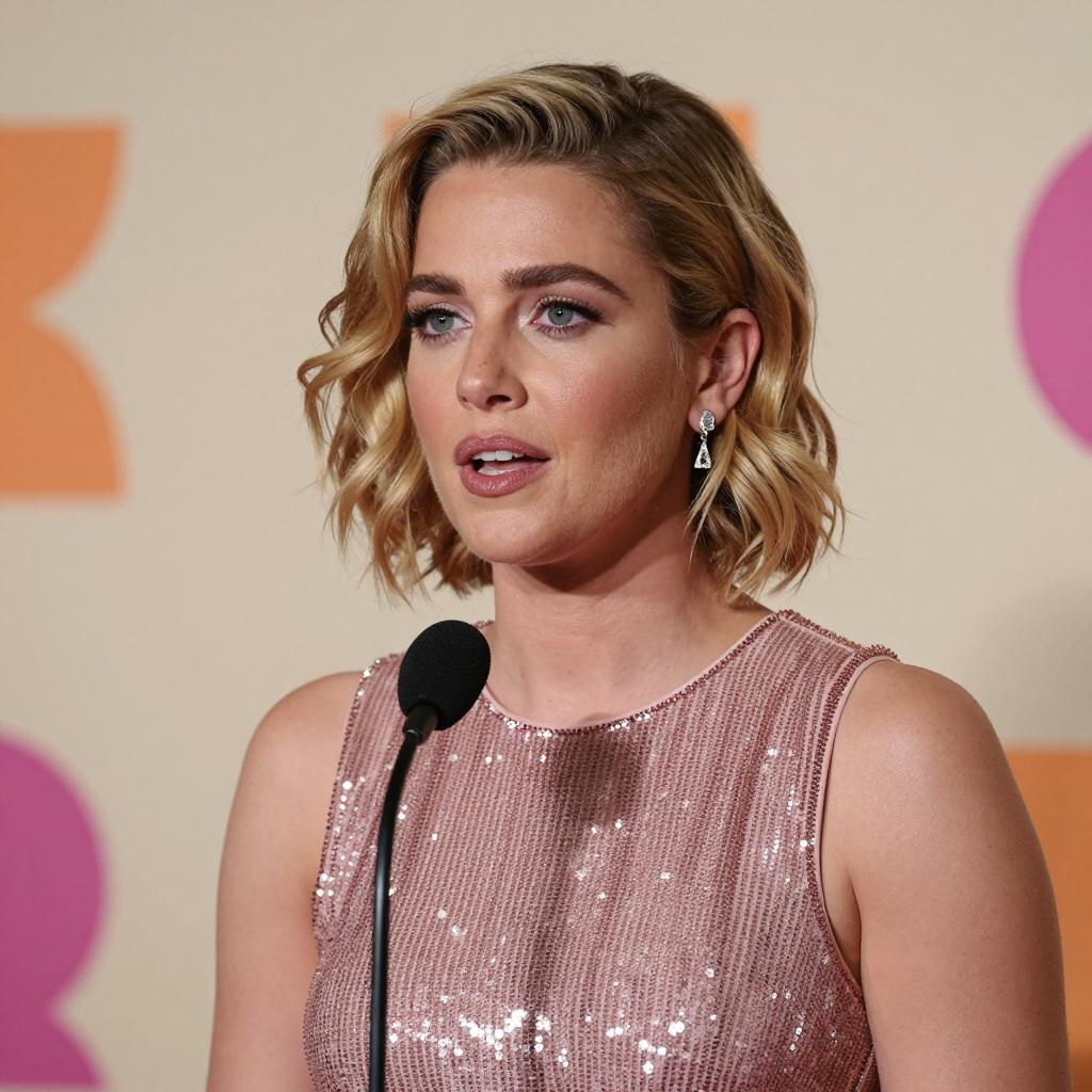 Candid photograph of a blonde woman with short, curly hair, red lipstick, and red nail polish. She touches her chin with her left hand, wearing a strapless top and a sparkly bracelet. Background includes pink and black lights and blurred figures. She has blue eyes and a confident expression. Black microphone cord on her shoulder.