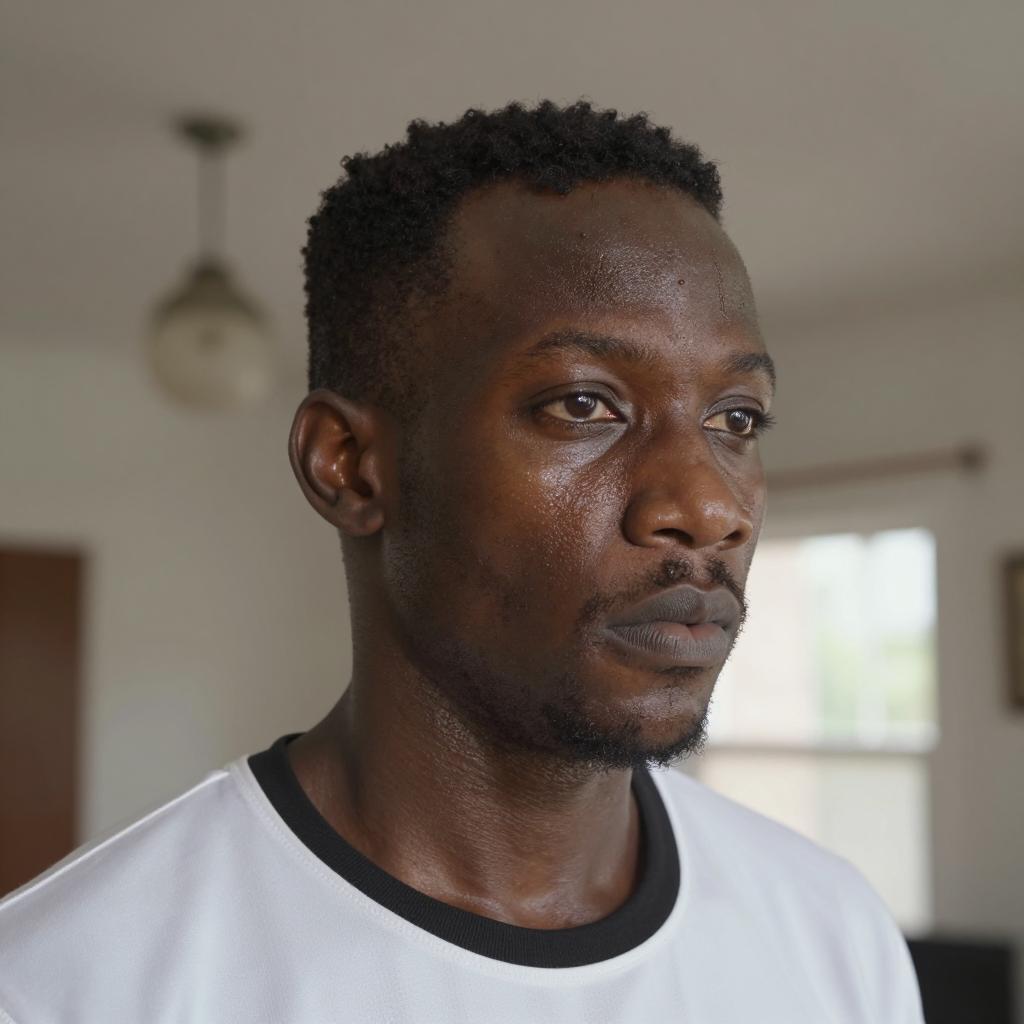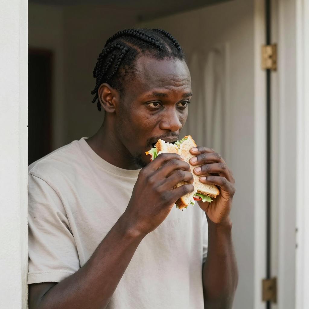 Close-up of a Black man with short hair, eyes closed, mouth open wide, eating a large, rough-ured, brown object. Dark background with blurred vertical lines. Multiple small brown particles in mid-air around his face. Man's skin is dark and slightly glistening. White cloth around his neck.