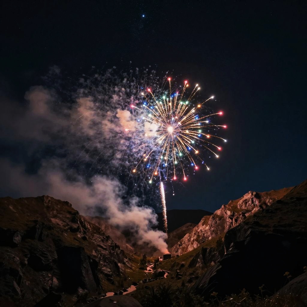 A photograph captures a vibrant fireworks display against a dark night sky. Bright, multicolored bursts of light radiate from the center, with white and red sparks illuminating the surroundings. A tall, narrow firework streaks down from the top, surrounded by wisps of white smoke. The foreground features rugged, dark mountainous terrain, with jagged peaks and shadows. The contrast between the bright fireworks and the dark landscape emphasizes the explosion's brilliance. The overall scene is dynamic and festive, highlighting the natural beauty of the mountains under the night sky.