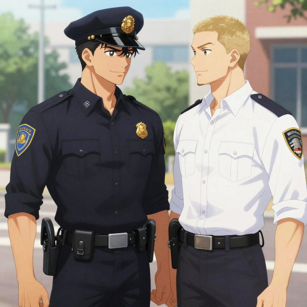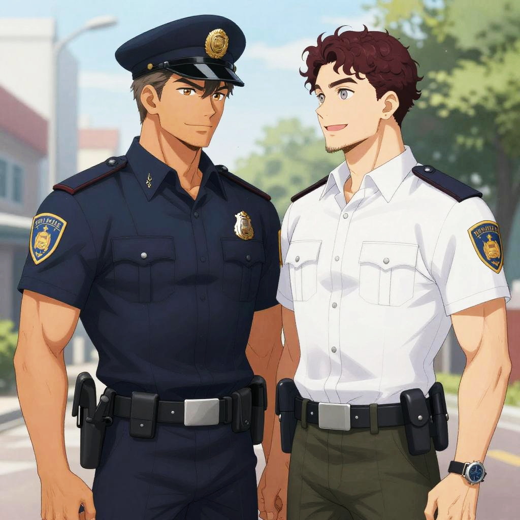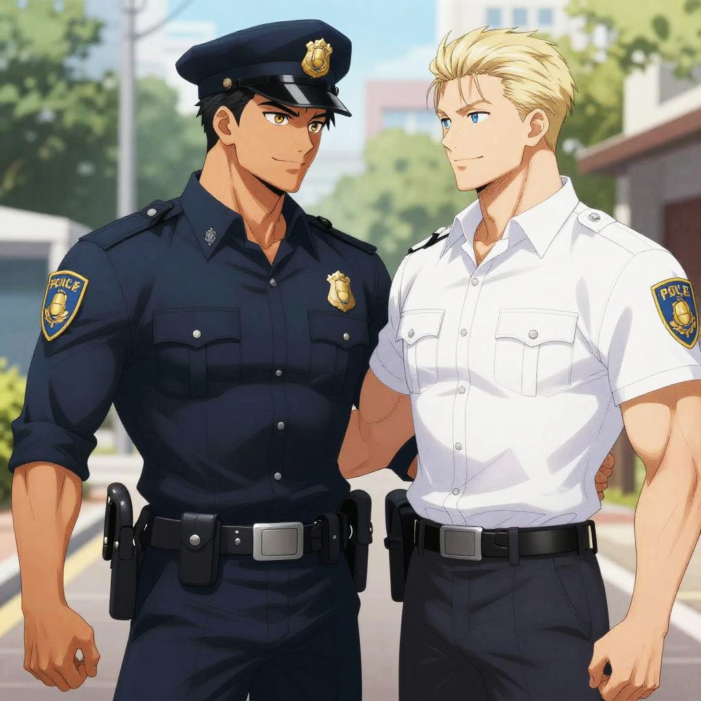 Upper body, 2boys, couple, face-to-face, smile, eye contact, looking at another, outdoors, police, police uniform, mature muscular male with midnight blue dyed hair, short spikes, violet eyes, wearing a navy blue shirt, charcoal pants, police cap, collared shirt, belt, mature muscular male with strawberry blond hair, swept back, blue eyes, wearing a white shirt, medium navy pants, collared shirt, belt, thick mustache, yaoi, detailed clothes description, bara, large pectorals, pectoral press, sideburns, anatomy