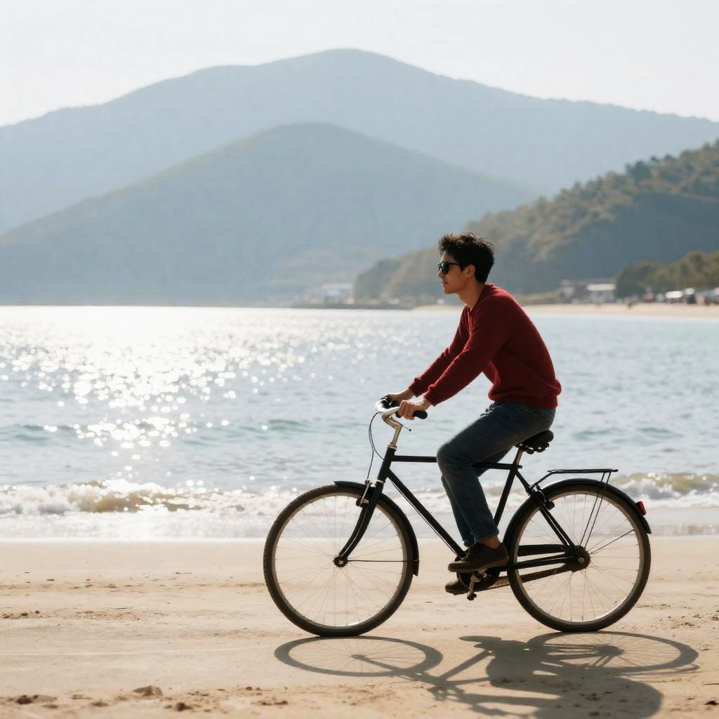 Man riding a black bicycle along a beach with mountains in the background. He wears a red sweater and jeans, with sunglasses on. Sunlight reflects off the water, casting a shadow of the bicycle on the sand. Misty mountains rise in the distance.