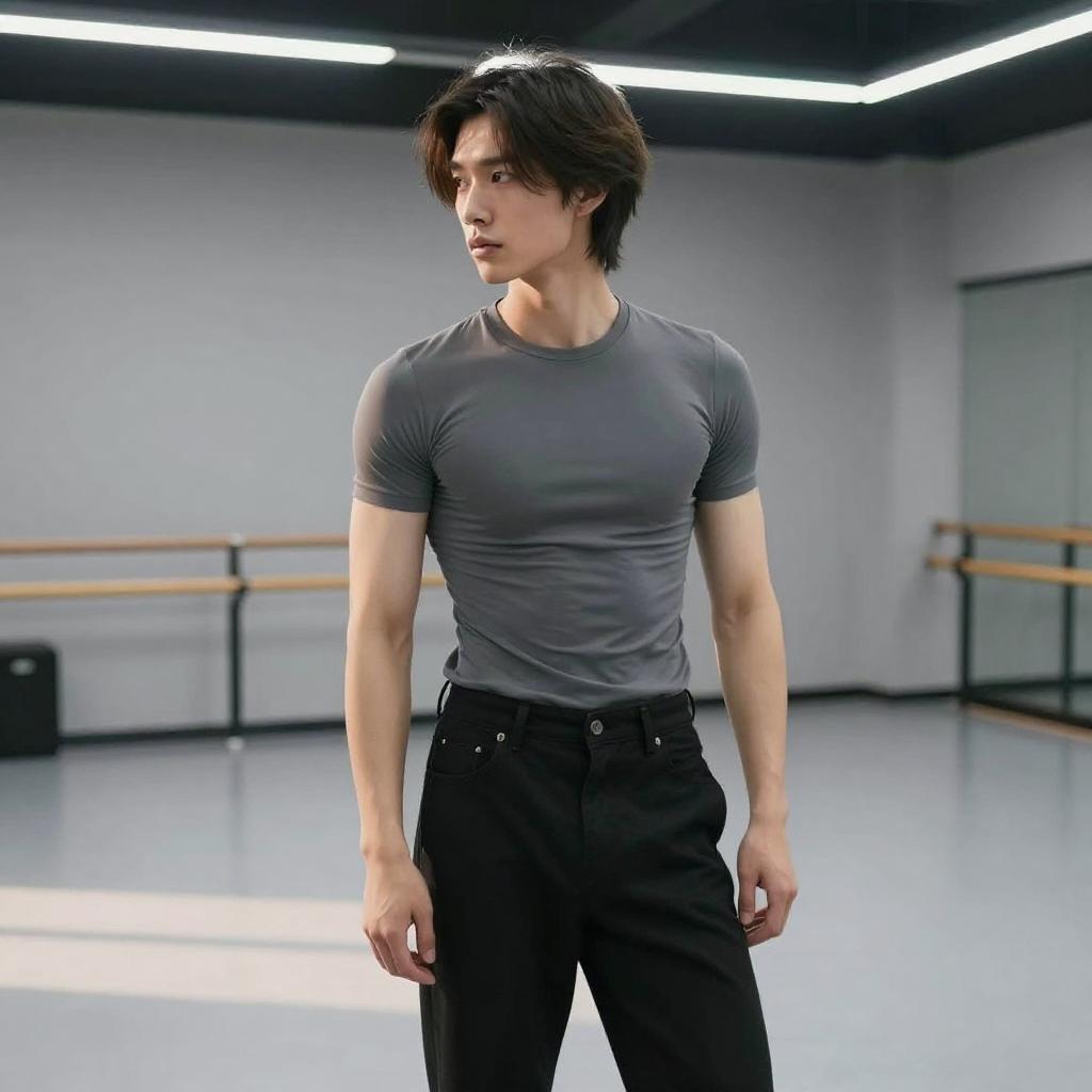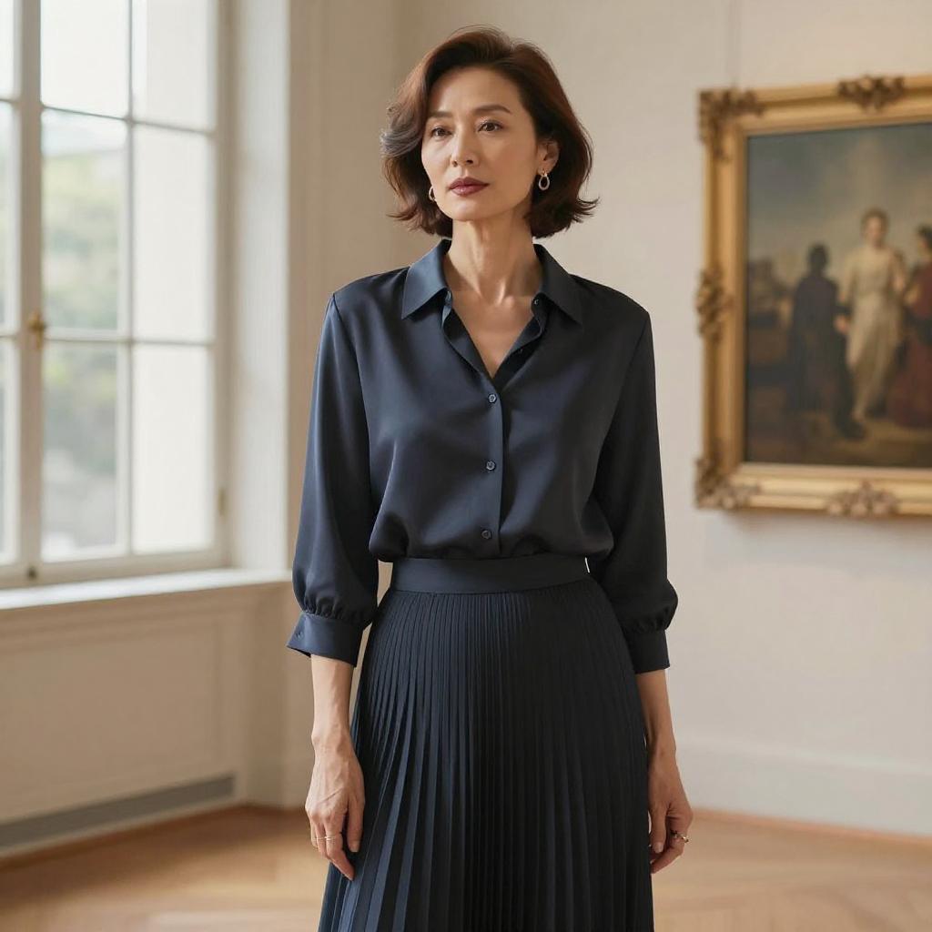 Photograph of an Asian woman with short, wavy black hair standing on a beach at sunset. She wears a pastel-colored, semi-transparent sundress with thin straps and a V-neck, which gently billows in the breeze. Her expression is neutral, and she gazes slightly to the side. The background features a serene ocean with gentle waves and a glowing sunset, casting a warm orange and pink hue over the sky and water. The sandy beach is visible in the foreground, with small waves lapping at the shore. The overall scene is calm and picturesque.