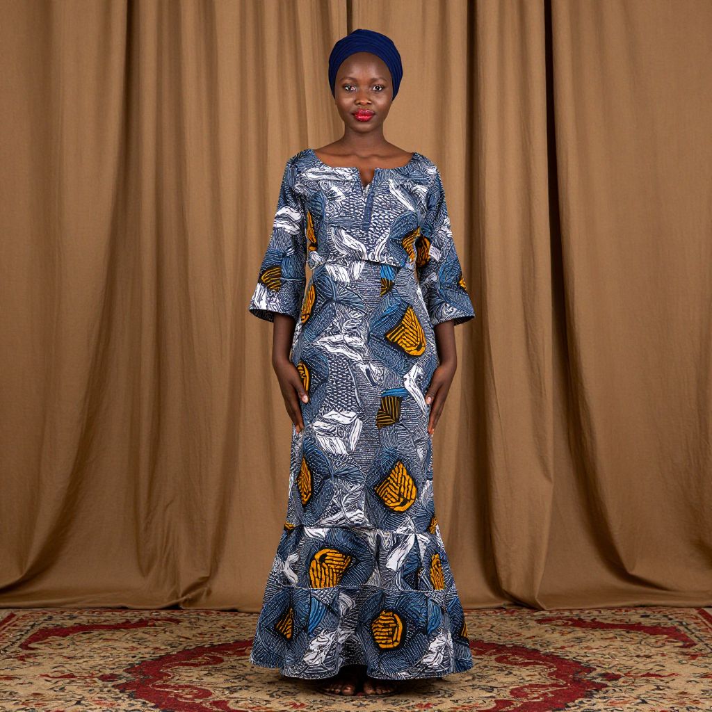 Photograph of a standing Black woman with medium brown skin and red lipstick, wearing a blue, white, and yellow patterned, long-sleeved, ankle-length dress with a round neckline. She has a blue headwrap and stands in front of beige, floor-length curtains. The floor features a patterned carpet with red and beige accents. Her expression is neutral, and her hands rest by her sides. The image has a studio-like quality with even lighting.