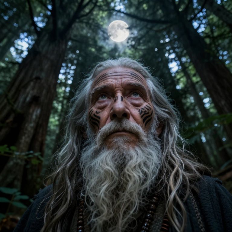 Envision a photorealistic portrait of an aged mystic, their deep eyes holding ancient wisdom and their face adorned with intricate tribal markings. Bathed in ethereal moonlight filtering through an old-growth forest canopy, the scene casts dappled shadows from a unique 'bug's-eye view' perspective. This captivating image seamlessly blends hyperrealistic details with a dreamlike atmosphere, evoking emotions ranging from serenity to intrigue and drawing viewers into the enigmatic world of this venerable seer.