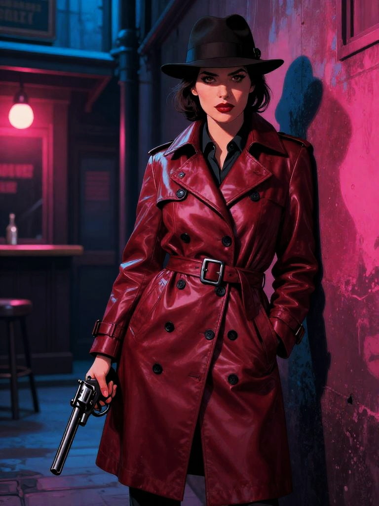 Mysterious bounty hunter in diner parking lot under flickering sign, wearing leather duster and fedora, holding steaming paper coffee cup, moody lighting, teal and magenta, cinematic, highly detailed, dramatic, graphic novel illustration, 2d shaded retro comic book