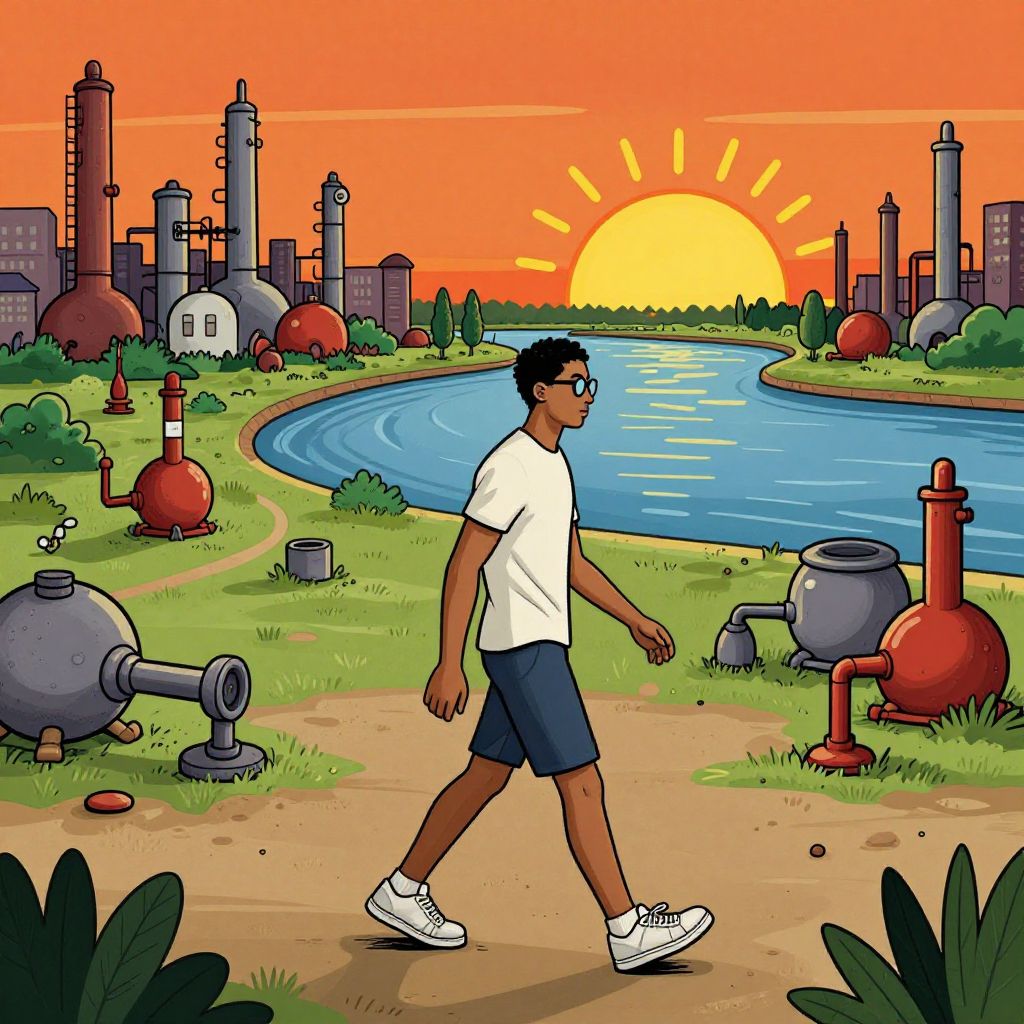 Illustration of a young athletic man wearing glasses, a white t-shirt, blue shorts, and white sneakers walking on a path through a chemical park. The background shows industrial chemical tanks and towers, a large river reflecting the setting sun, and an orange sunset sky.