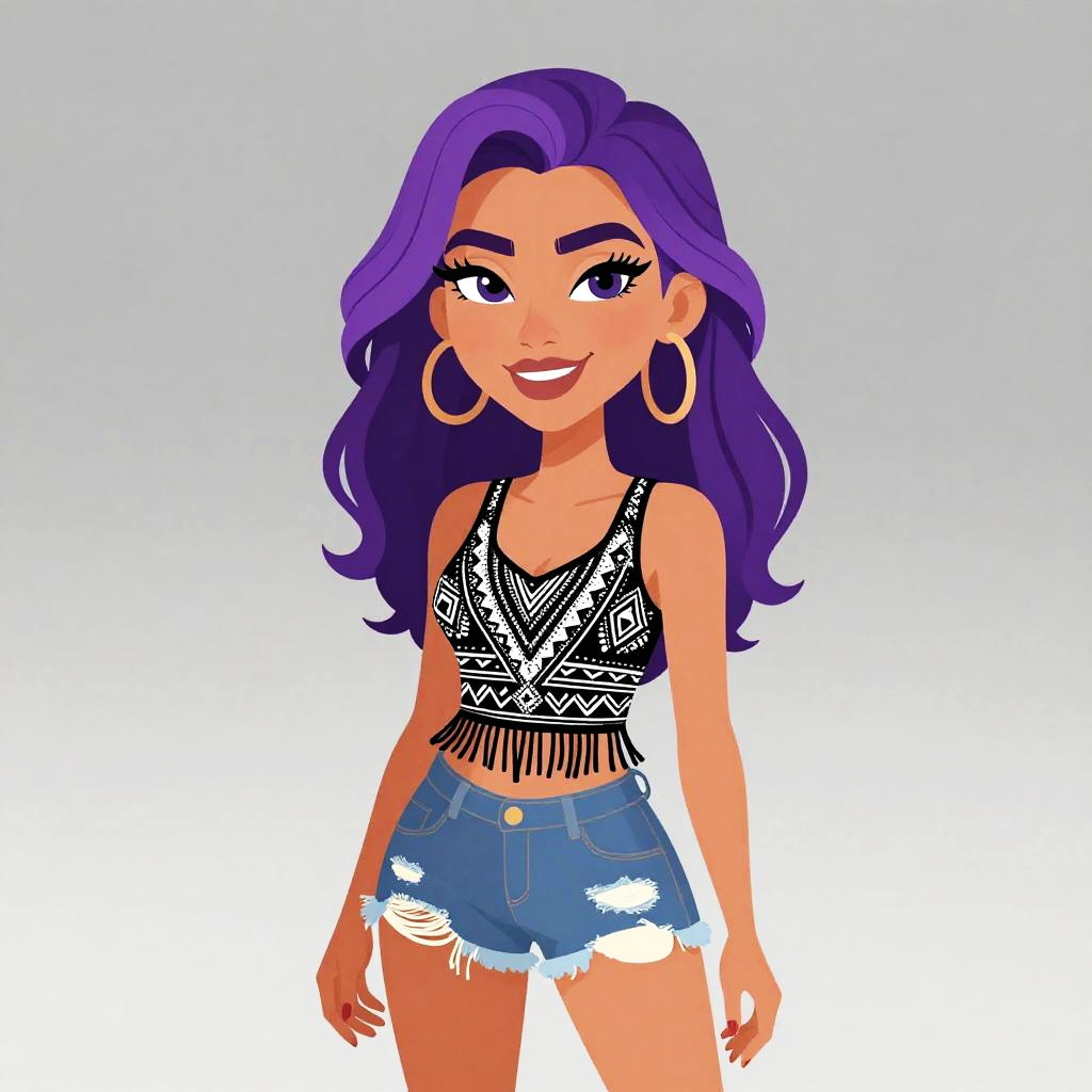 Cartoon woman with purple hair, pink ruffled top, white pants, brown sandals, smiling, standing, white background, digital art.