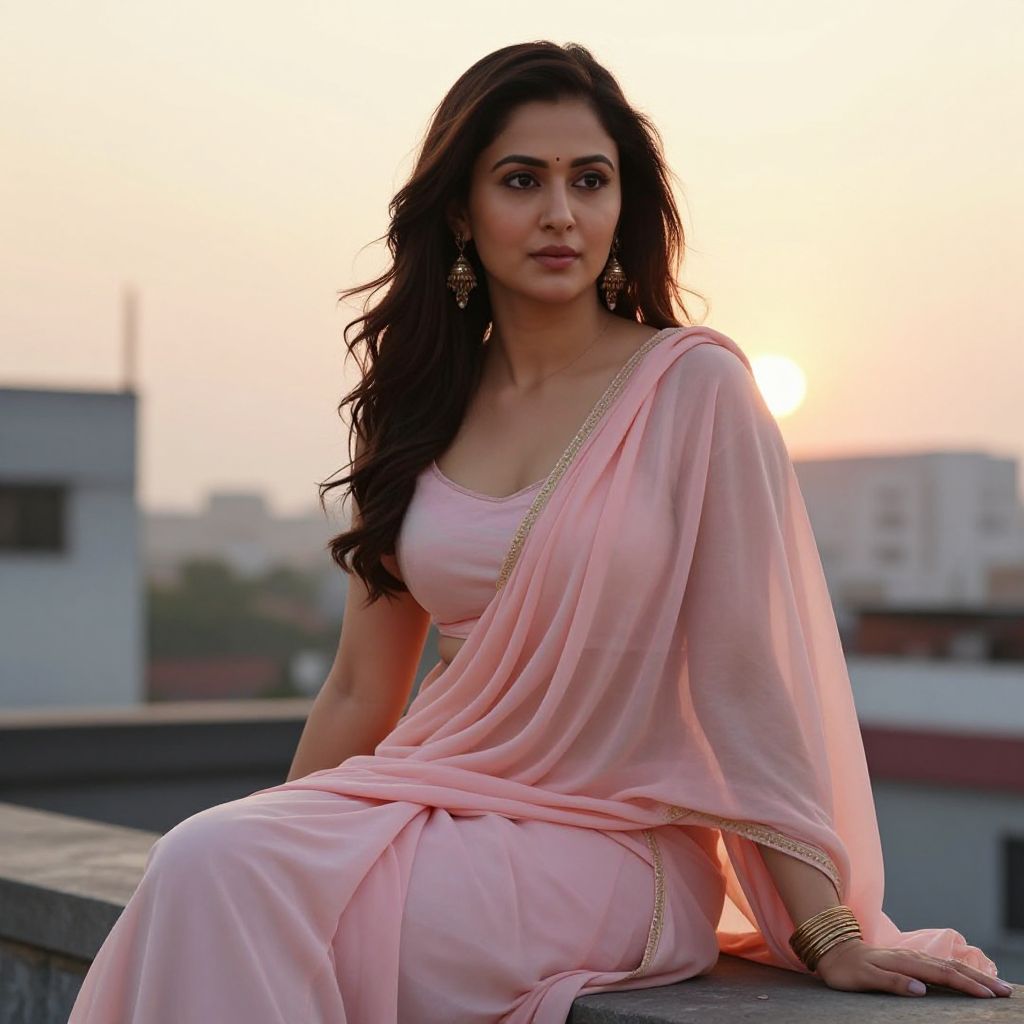 Bollywood actress AI prompt: A soft, natural-looking AI portrait of a confident Bollywood actress sitting on a rooftop in Mumbai, wearing a pastel choli and pale pink dupatta, with a warm sunset background, emphasizing calm elegance and cultural authenticity in AI-generated imagery.