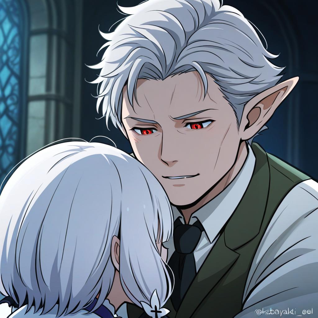 Astarion, baldur's gate, 1boy, red eyes, short hair, white hair, grey hair, white shirt, vampire, elf, by artist kabayaki (kabayaki eel), illustrious