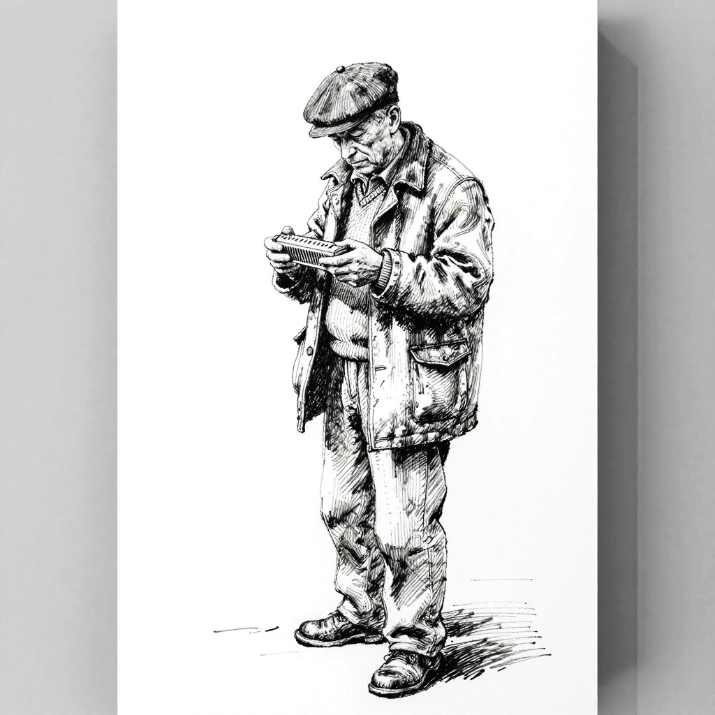 This is a stippling ink drawing study of an elderly man with a newsboy cap and wool coat holding a harmonica. One leg slightly forward, head tilted down, eyes on the strings. Quick gestural lines, confident hatching, smudged shading, casual and spontaneous. High contrast black and white on mostly white background with soft gray side borders and subtle paper texture. Clean composition, minimal props, slight figure tilt. Studio light from above, gentle falloff, elegant and restrained mood.