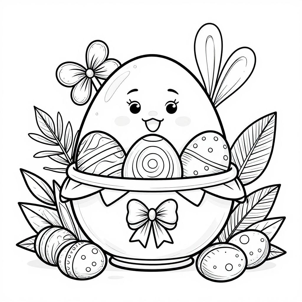 Black and white line art illustration of a happy Easter egg basket with decorated eggs, flowers, and leaves. The basket features a ribbon bow, and the overall image is designed as a high-resolution coloring page suitable for adults. Bold, crisp vector lines on a clear white background.