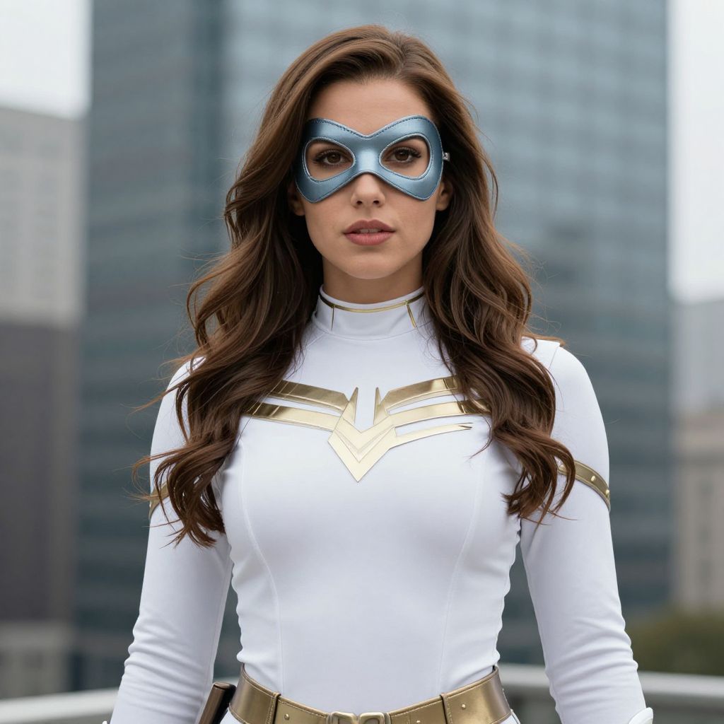 Female superhero white, 1girl, solo, brown hair, long hair, mask, bodysuit, belt, brown eyes, gloves, superhero, lips, city, building