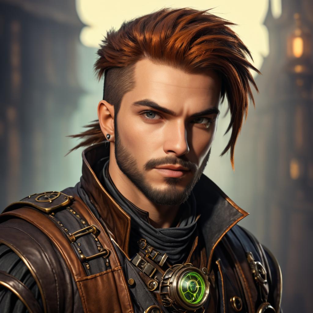 Detailed portrait of a young Caucasian male rogue styled in steampunk fashion, featuring reddish-brown hair, a neatly trimmed beard, and striking green eyes. He wears a dark leather jacket adorned with vintage brass clockwork mechanisms and intricate steampunk accessories, set against a softly blurred background with warm lighting.