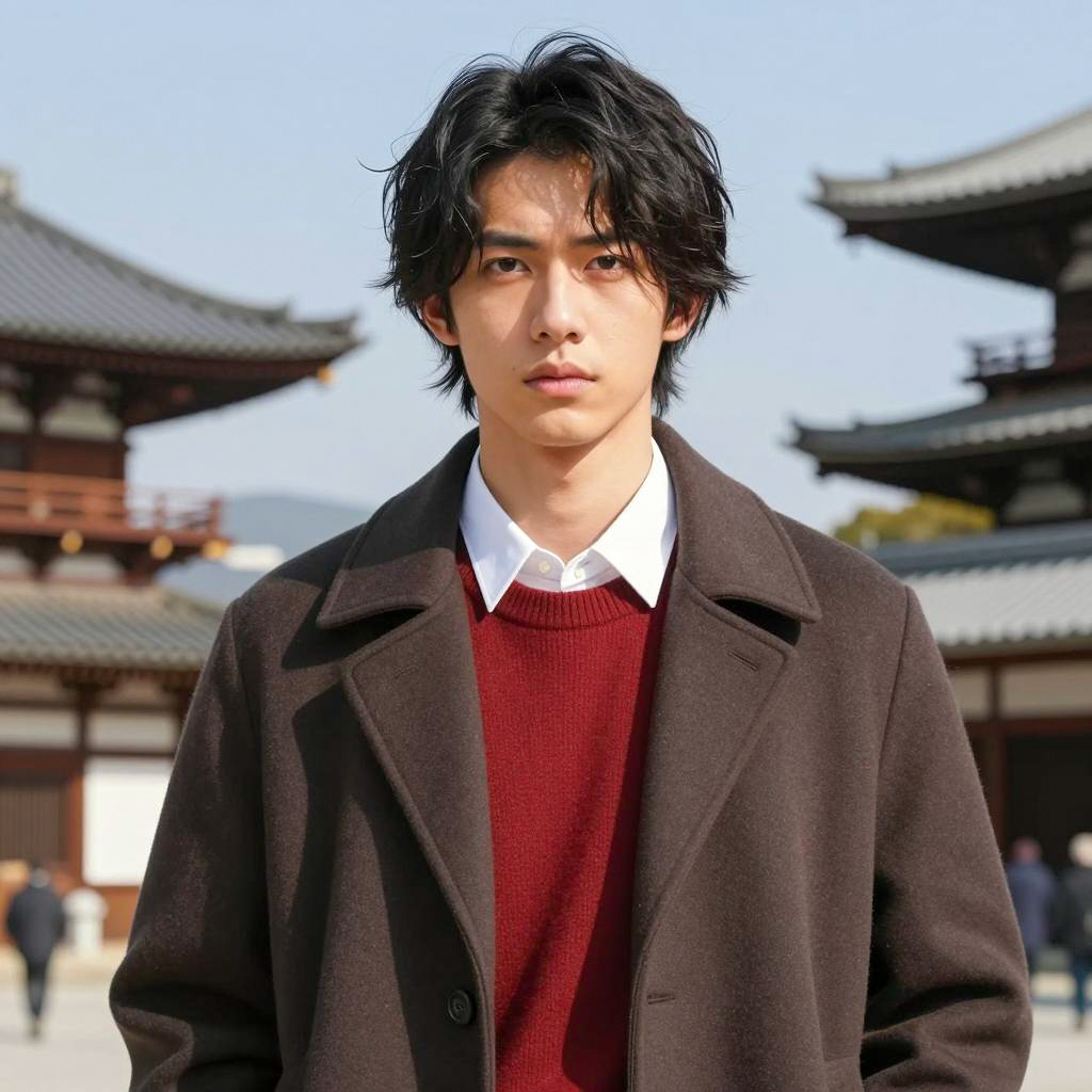 Young Asian male with black hair, wearing a white dress shirt, holding a katana over his right shoulder. Standing on a wooden bridge, looking to the left with a focused expression. Blurred background with a hint of greenery. CKS-JAPAN on the right. Photo style, realistic.