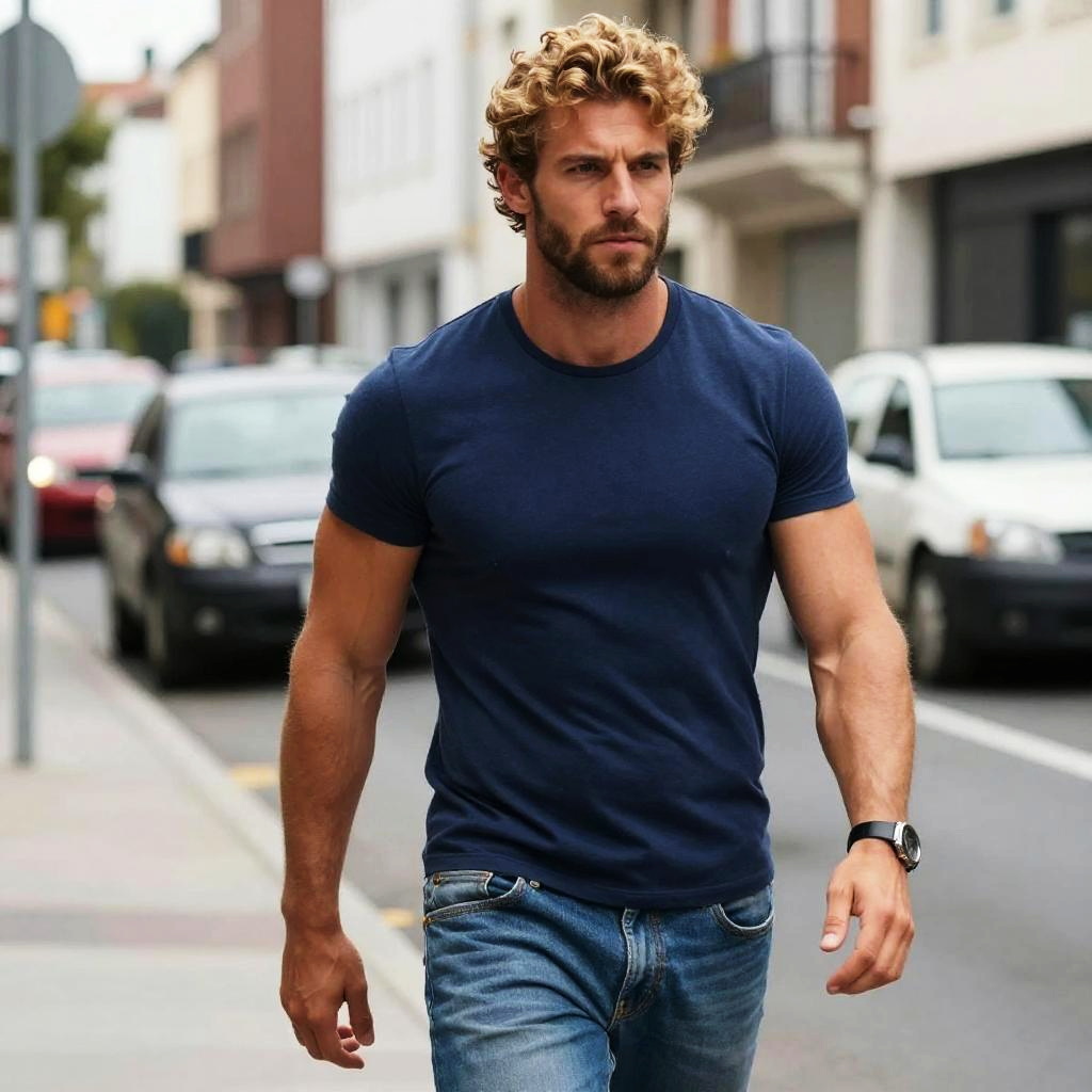 Photograph of a fit, attractive man with short, tousled brown hair and blue eyes. He has a slight smile and is wearing a tight, navy blue t-shirt that highlights his muscular arms and chest. The background is plain white, making him the focal point. His skin is lightly tanned, and he has a confident, approachable look. The lighting is bright and even.