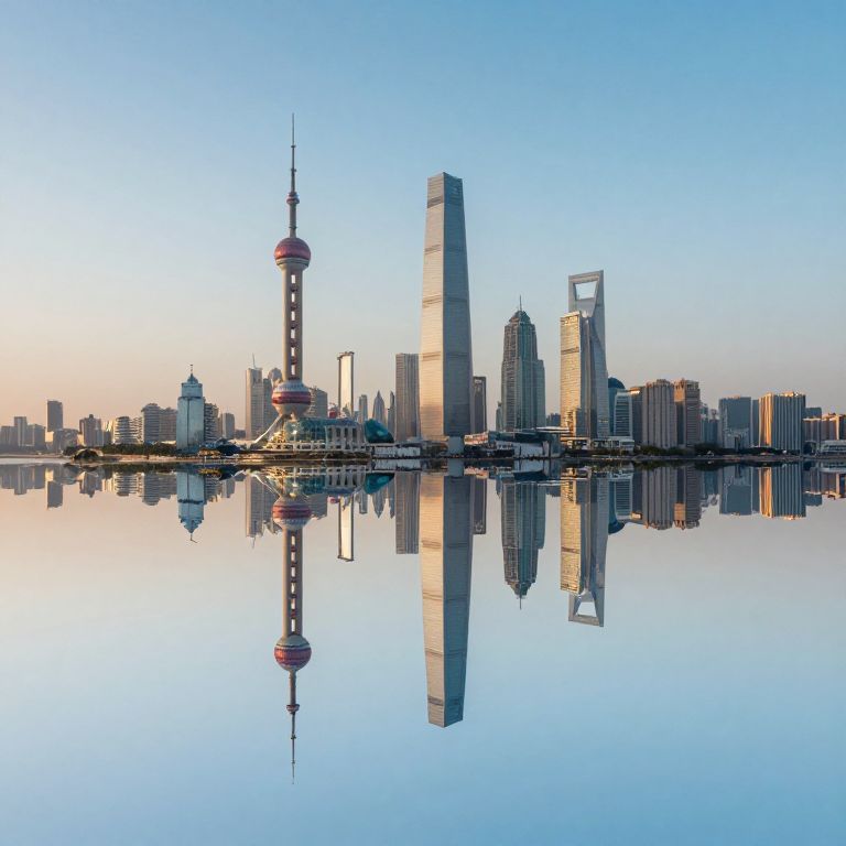 Photograph of Shanghai skyline at sunset, featuring the Oriental Pearl Tower, Shanghai Tower, and other skyscrapers, reflected in calm water.