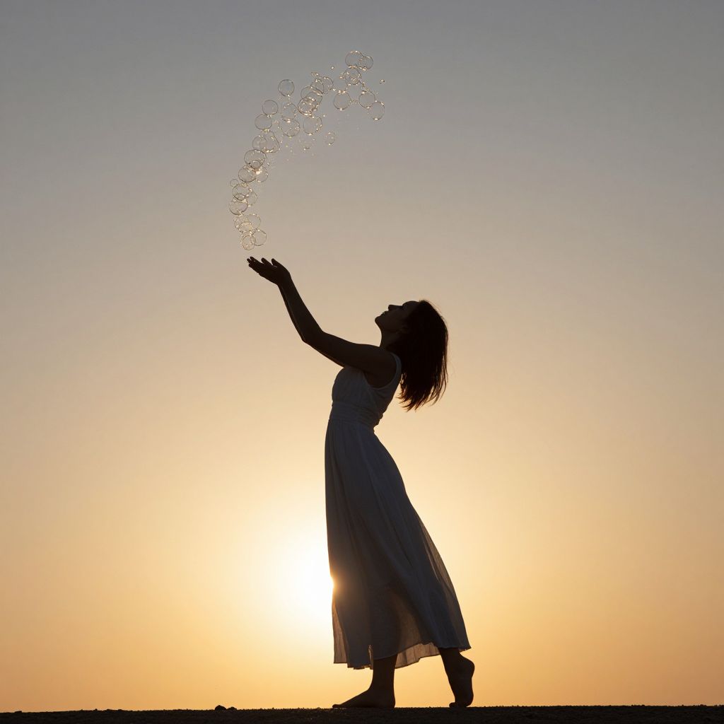 Silhouetted against the setting sun, a woman in a flowing white dress stands gracefully as a mesmerizing cascade of translucent bubbles ascends and disperses above her, creating a serene and ethereal ballet-like scene.
