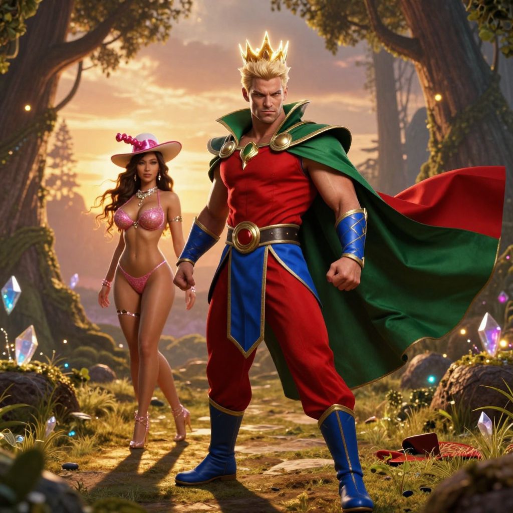A muscular male with blonde hair and a glowing crown on his head stands proudly, wearing a vibrant red and blue outfit with a flowing green and red cape that flutters in the wind. He has a fierce, confident expression, with strong features and a commanding presence. In the background, a sexy woman with long flowing hair and a pink and white hat stands gracefully, her figure curvaceous with big tits and a seductive look, adding a bold contrast to the scene. The setting is a mystical, enchanted forest at sunset, with golden light casting long shadows and magical elements like floating crystals and glowing trees in the distance. The atmosphere is dramatic, cinematic, and full of fantasy energy.