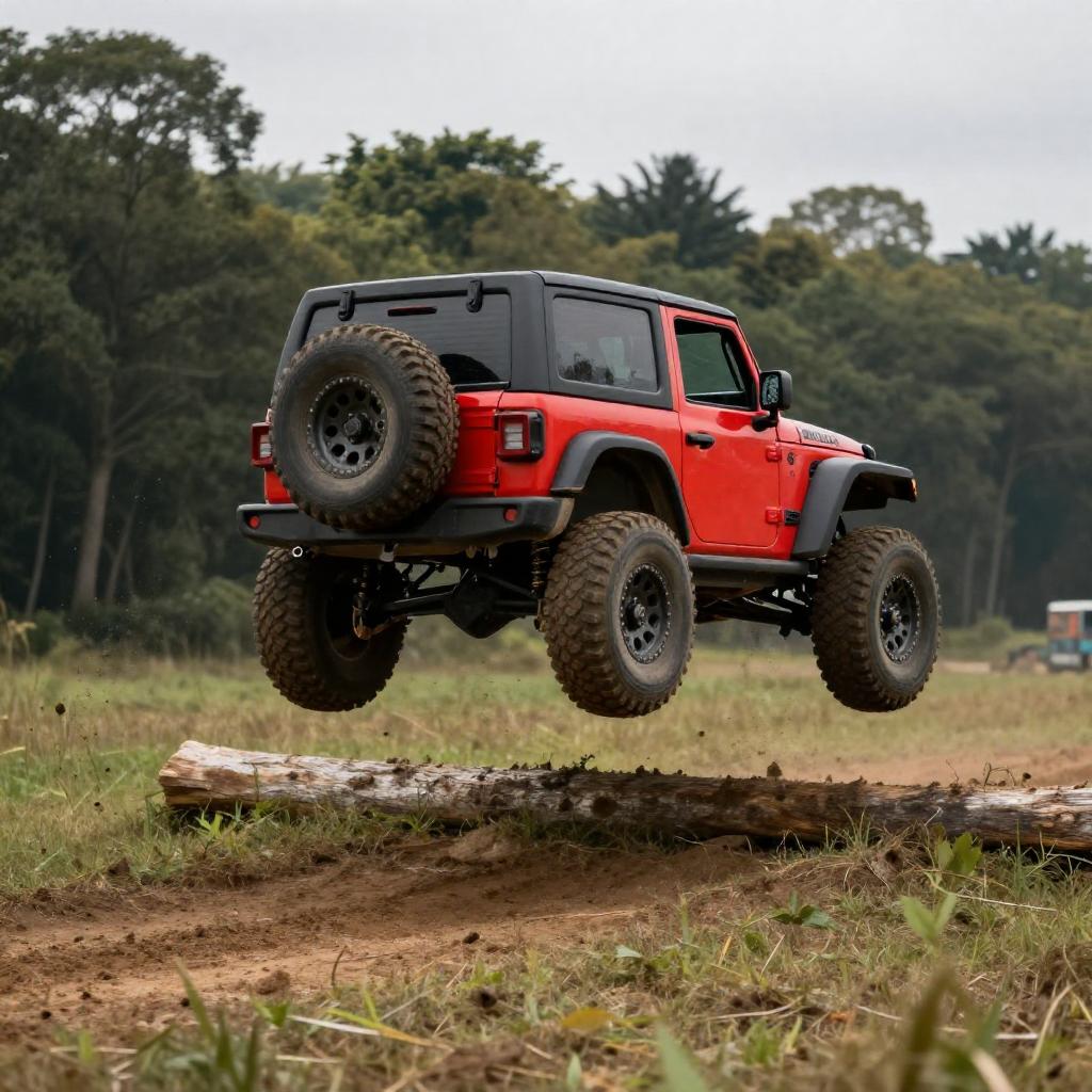 Photograph of a red off-road vehicle mid-air, performing a jump over a log on a muddy, grassy field. The vehicle's black tires are fully extended, and debris flies around. Background features a dense forest with tall trees under a cloudy sky. The vehicle's rear spoiler is visible, and the scene is dynamic and action-packed.