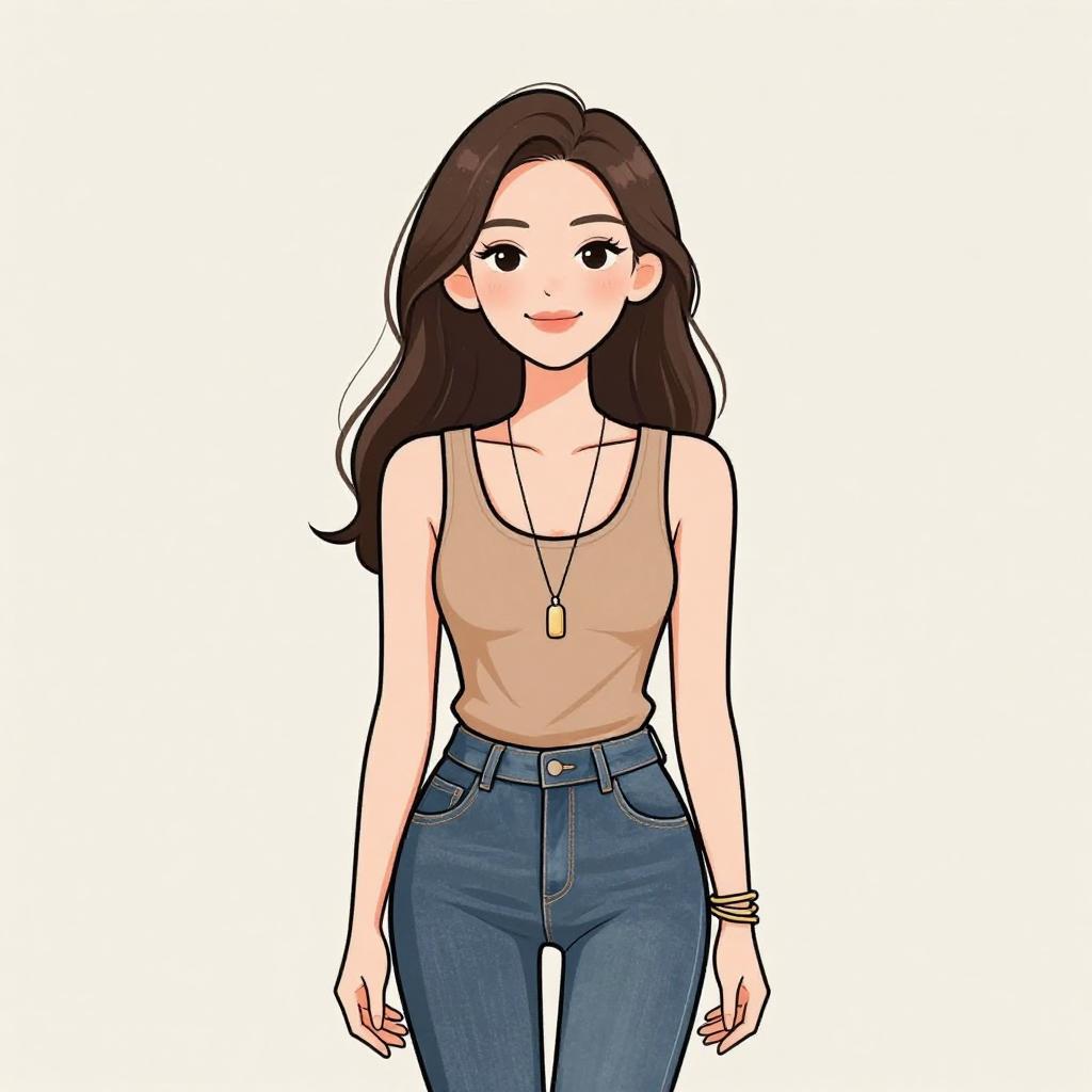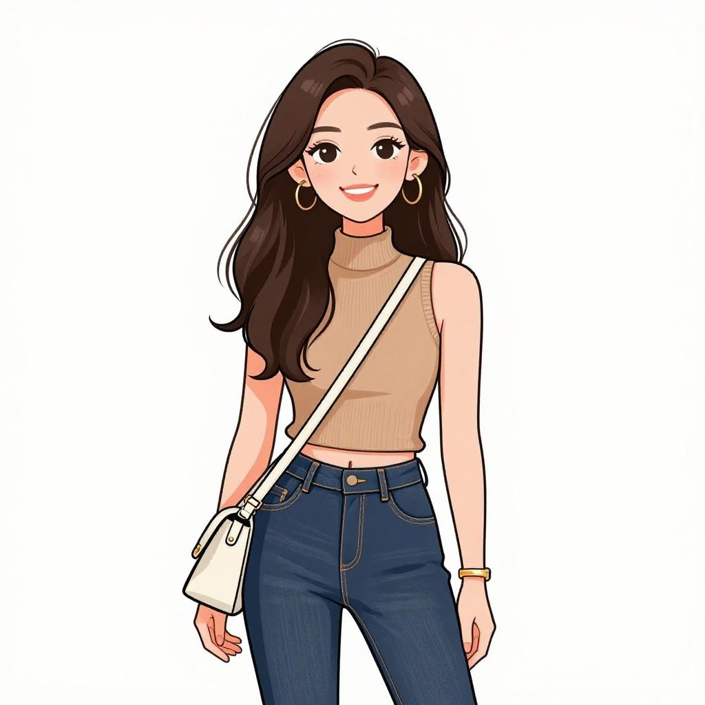 Woman with pretty face and pretty hair. smiling Woman, minimalistic chic, short-sleeved nude top with metallic chain neckline detail, dark blue skinny jeans, thin tan shoulder bag, delicate chain bracelet. --sref 1467