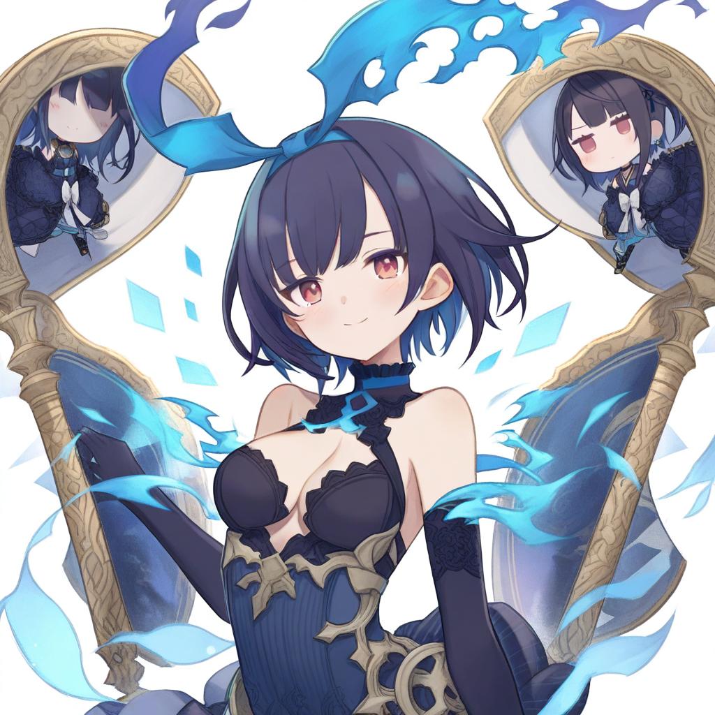 Digital anime-style illustration of Alice from the game Sinoalice. The character has short, dark blue hair and red eyes, wearing an elaborate dark blue and black corset dress with elbow gloves. She is surrounded by mystical blue flames and two ornate mirrors reflecting chibi versions of herself. The artwork features a fantasy and magical theme with detailed clothing and accessories.