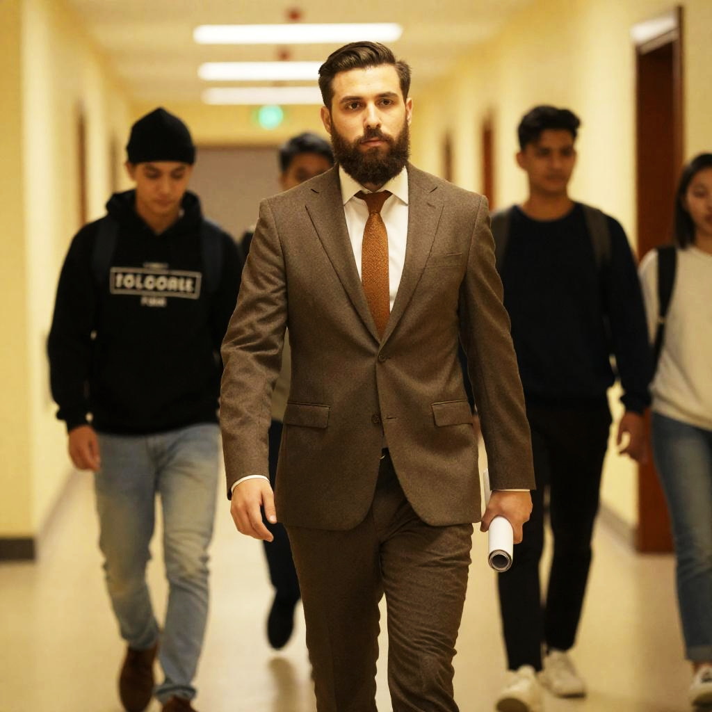 Photograph of a bearded man in a brown suit, white shirt, and brown tie walking down a yellow-lit hallway. He holds a rolled-up paper in his left hand. Other students in casual attire and a black beanie walk behind him. Warm, indoor setting. Several people, background blur.
