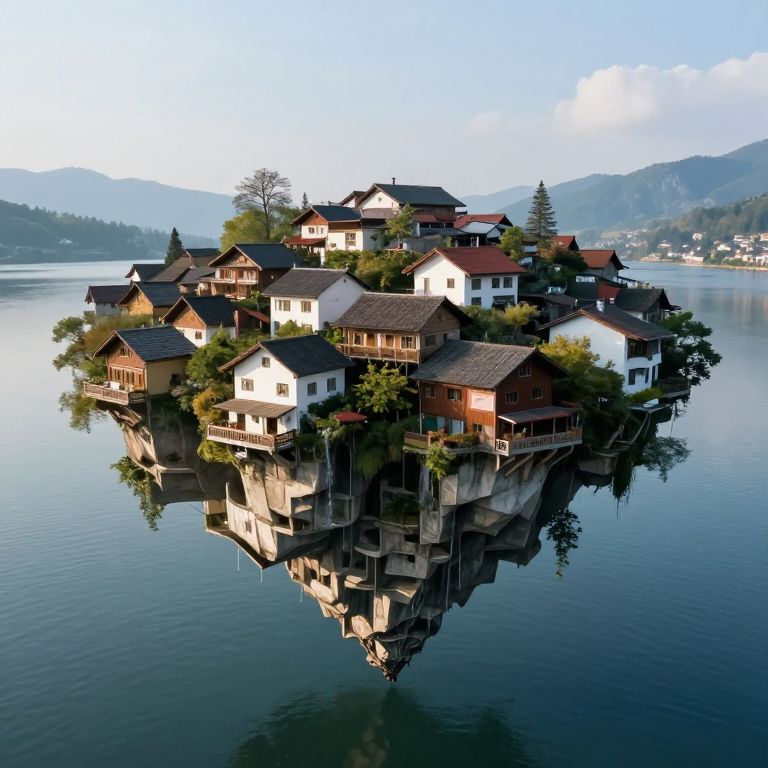 A serene lakeside village floats serenely above a mesmerizing inverted world, where the foundations of quaint houses seamlessly transform into cascading, tiered platforms that descend into the depths, defying gravity and reality alike.