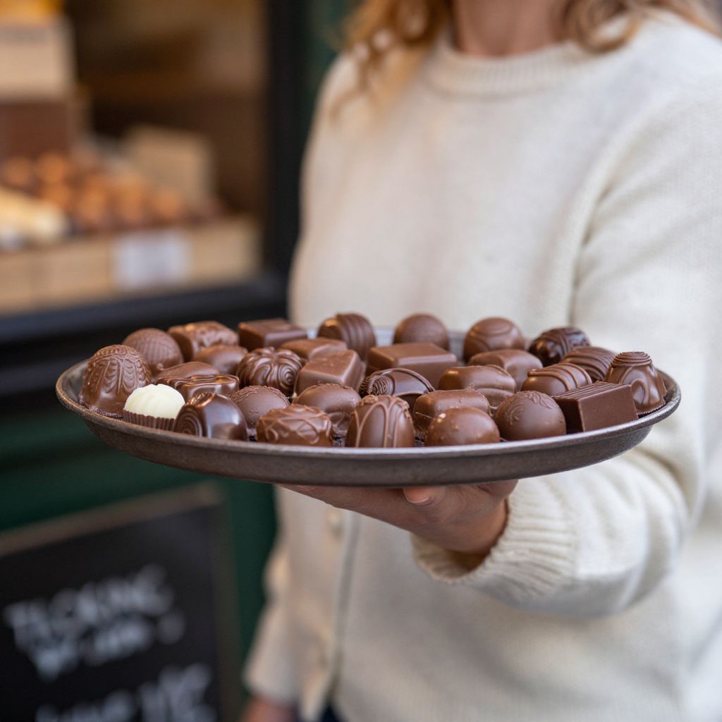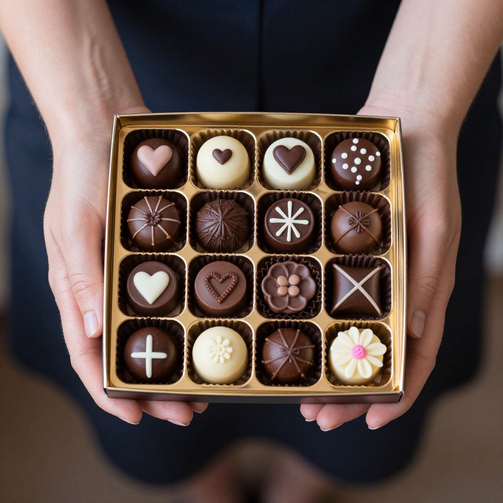 Gourmet chocolate truffles elegantly presented in a square brown box, featuring nine individually wrapped spheres adorned with white sprinkles and smooth coatings, labeled \"Vegan Treats Fatally Yours.\