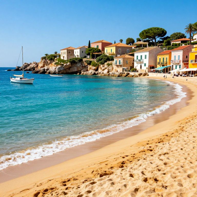 Photograph of a vibrant, sunlit Mediterranean beach scene. The sandy shore curves gently to the right, with clear, turquoise water lapping at the edge. A small white sailboat is anchored to the left. In the background, colorful, two-story houses in shades of yellow, orange, and white with red-tiled roofs are nestled on a rocky hillside. Pines and other greenery dot the landscape. The sky is a bright, clear blue. The textures include smooth sand, gentle waves, and rocky outcrops. The setting evokes a tranquil, picturesque coastal village.