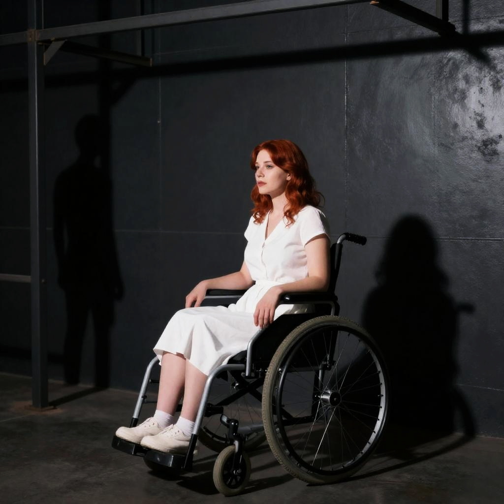 Photograph of a young woman with red hair wearing a white dress seated in a wheelchair. She is positioned against a dark industrial-style wall with strong lighting casting sharp shadows of her and a silhouetted person standing to her left. The setting is minimalistic and dramatic, emphasizing contrast and shadow play.