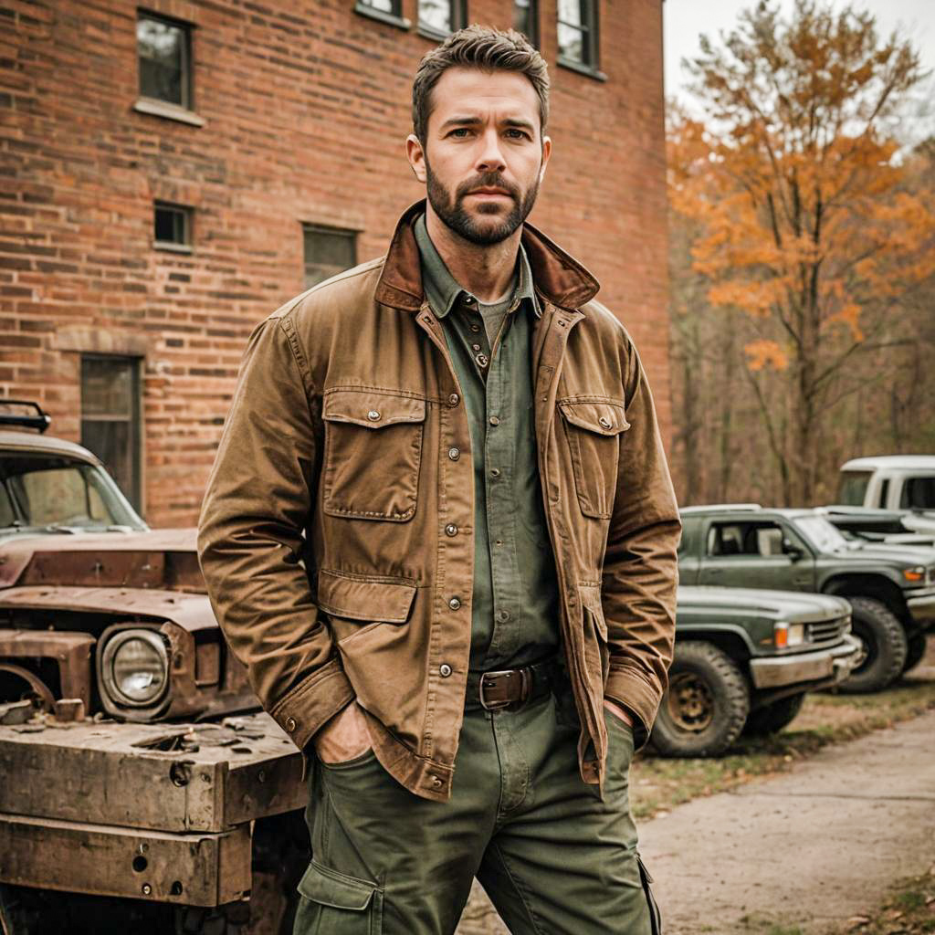 Photo of a Rugged Build man, Hard Part, country outfit, olive green cargo jacket with a grey henley shirt and tactical boots, burnt orange and brown, contrasting warm tones